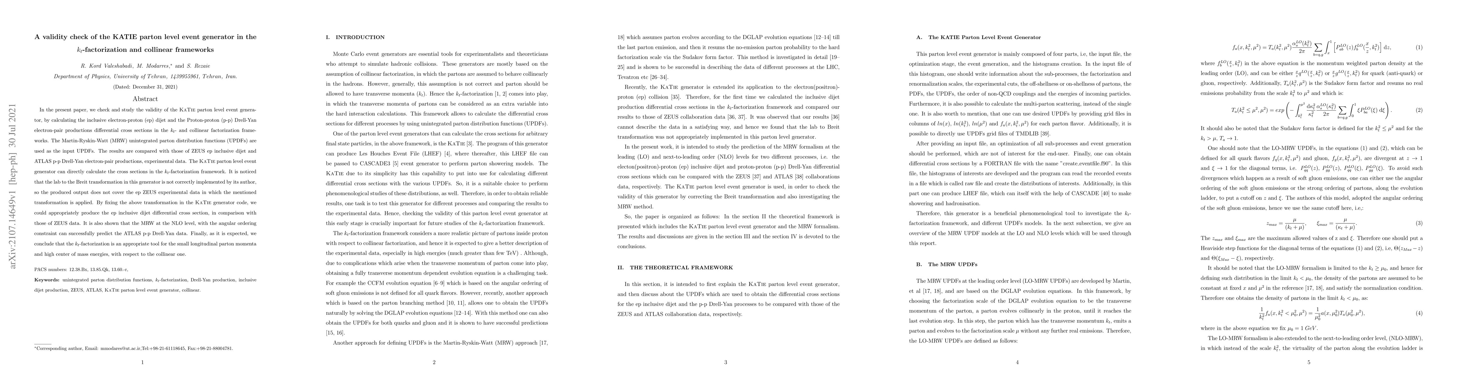 In the present paper, we check and study the validity of the \textsc{KaTie} parton level event generator, by calculating the inclusive electron-proton (ep) dijet and the Proton-proton (p-p) Drell-Yan electron-pair productions differential cross sections in the $k_t$- and collinear factorization frameworks. The Martin-Ryskin-Watt (MRW) unintegrated parton distribution functions (UPDFs) are used as the input UPDFs. The results are compared with those of ZEUS ep inclusive dijet and ATLAS p-p Drell-Yan electron-pair productions, experimental data. The \textsc{KaTie} parton level event generator can directly calculate the cross sections in the $k_t$-factorization framework. It is noticed that the lab to the Breit transformation in this generator is not correctly implemented by its author, so the produced output does not cover the ep ZEUS experimental data in which the mentioned transformation is applied. By fixing the above transformation in the \textsc{KaTie} generator code, we could appropriately produce the ep inclusive dijet differential cross section, in comparison with those of ZEUS data. It is also shown that the MRW at the NLO level, with the angular ordering constraint can successfully predict the ATLAS p-p Drell-Yan data. Finally, as it is expected, we conclude that the $k_t$-factorization is an appropriate tool for the small longitudinal parton momenta and high center of mass energies, with respect to the collinear one.