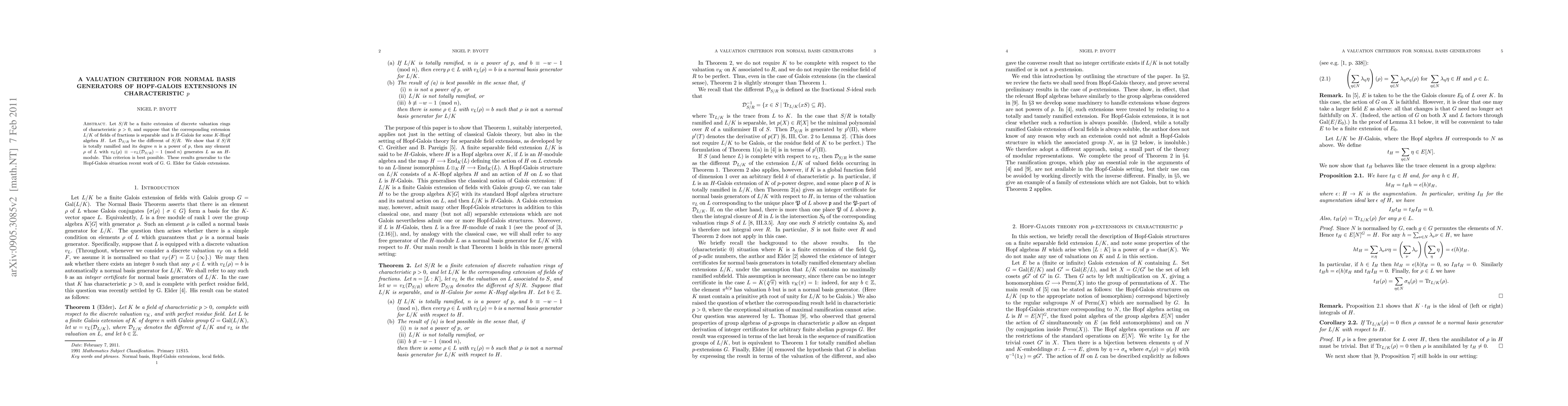 Let S/R be a finite extension of discrete valuation rings of characteristic p>0, and suppose that the corresponding extension L/K of fields of fractions is separable and is H-Galois for some K-Hopf algebra H. Let D_{S/R} be the different of S/R. We show that if S/R is totally ramified and its degree n is a power of p, then any element $\rho$ of L with $v_L(\rho)$ congruent to $-v_L(D_{S/R})-1$ mod n generates L as an H-module. This criterion is best possible. These results generalise to the Hopf-Galois situation recent work of G. Elder for Galois extensions.