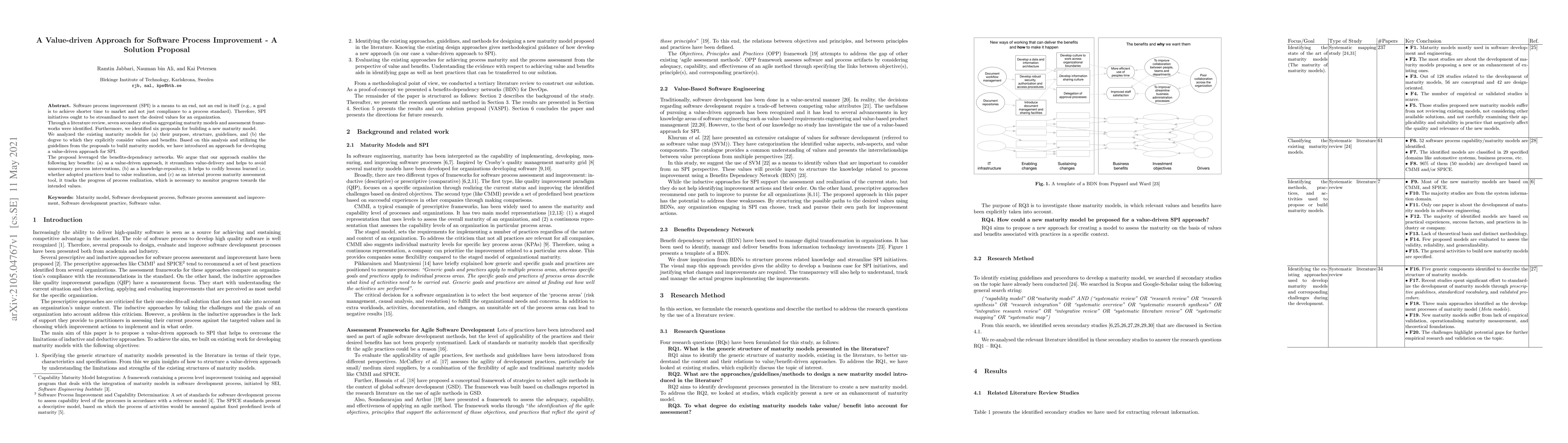 Software process improvement (SPI) is a means to an end, not an end in itself (e.g., a goal is to achieve shorter time to market and not just compliance to a process standard). Therefore, SPI initiatives ought to be streamlined to meet the desired values for an organization. Through a literature review, seven secondary studies aggregating maturity models and assessment frameworks were identified. Furthermore, we identified six proposals for building a new maturity model. We analyzed the existing maturity models for (a) their purpose, structure, guidelines, and (b) the degree to which they explicitly consider values and benefits. Based on this analysis and utilizing the guidelines from the proposals to build maturity models, we have introduced an approach for developing a value-driven approach for SPI. The proposal leveraged the benefits-dependency networks. We argue that our approach enables the following key benefits: (a) as a value-driven approach, it streamlines value-delivery and helps to avoid unnecessary process interventions, (b) as a knowledge-repository, it helps to codify lessons learned i.e. whether adopted practices lead to value realization, and (c) as an internal process maturity assessment tool, it tracks the progress of process realization, which is necessary to monitor progress towards the intended values.