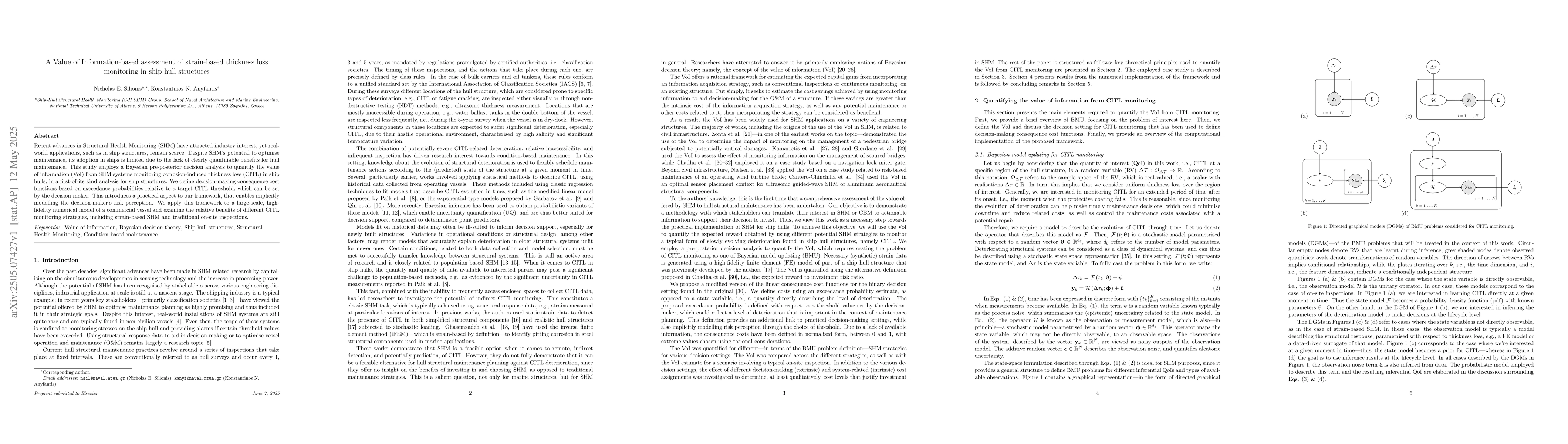 A study uses Bayesian analysis to quantify the value of information from SHM systems monitoring corrosion-induced thickness loss in ship hulls, showing strain-based monitoring offers relative benefits over traditional inspections.