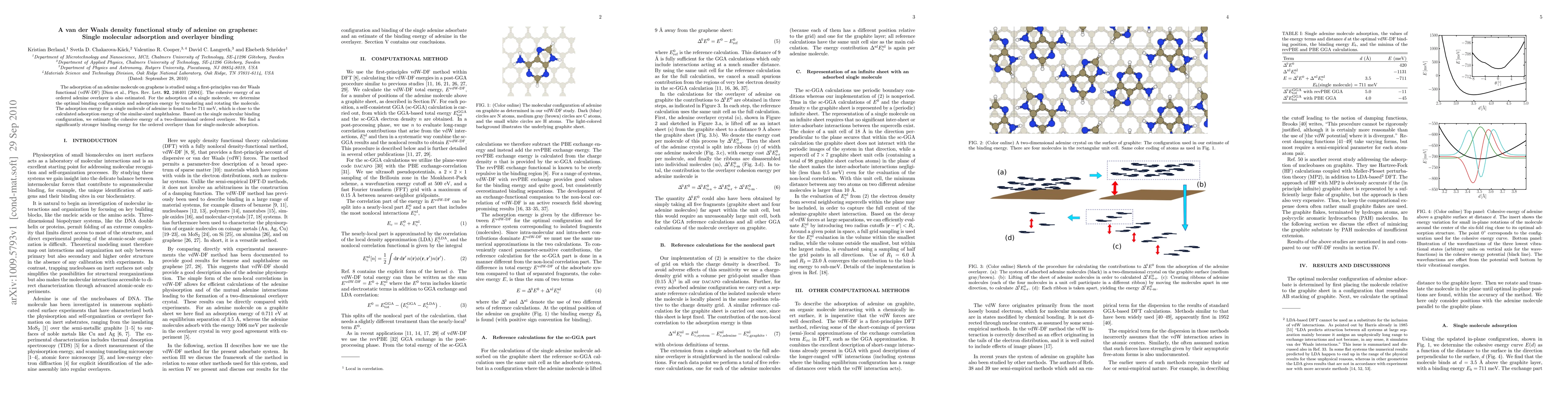 This study uses van der Waals density functional theory to investigate the adsorption of adenine on graphene, finding a single molecule's optimal binding configuration and a binding energy of 711 meV. It further estimates a stronger cohesive energy for a two-dimensional ordered adenine overlayer.