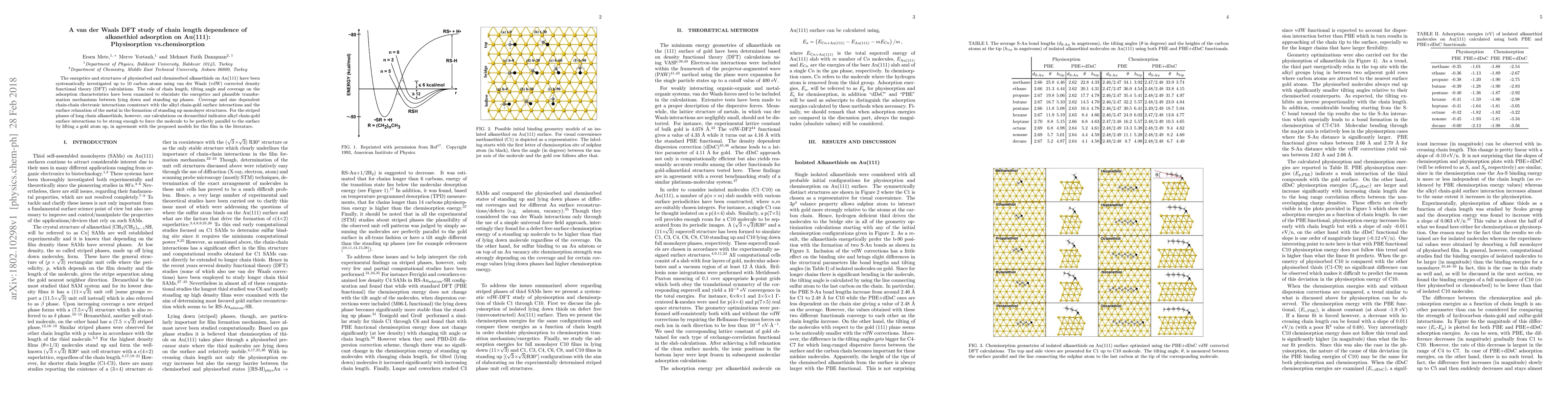 The energetics and structures of physisorbed and chemisorbed alkanethiols on Au(111) have been systematically investigated up to 10 carbon atoms using van der Waals (vdW) corrected density functional theory (DFT) calculations. The role of chain length, tilting angle and coverage on the adsorption characteristics have been examined to elucidate the energetics and plausible transformation mechanisms between lying down and standing up phases. Coverage and size dependent chain-chain electronic interactions counteract with the alkyl chain-gold surface interactions and the surface relaxation of the metal in the formation of standing up monolayer structures. For the striped phases of long chain alkanethiols, however, our calculations on decanethiol indicates alkyl chain-gold surface interactions to be strong enough to force the molecule to be perfectly parallel to the surface by lifting a gold atom up, in agreement with the proposed models for this film in the literature.