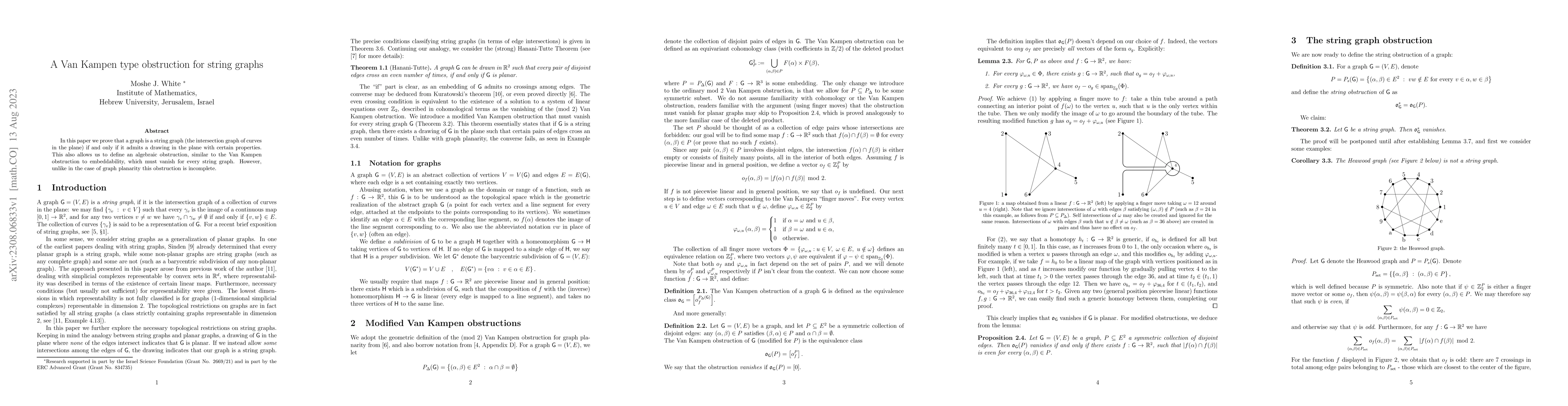 This paper establishes a necessary and sufficient condition for a graph to be a string graph, providing an algebraic obstruction akin to the Van Kampen obstruction, though it is noted to be incomplete unlike graph planarity obstructions.