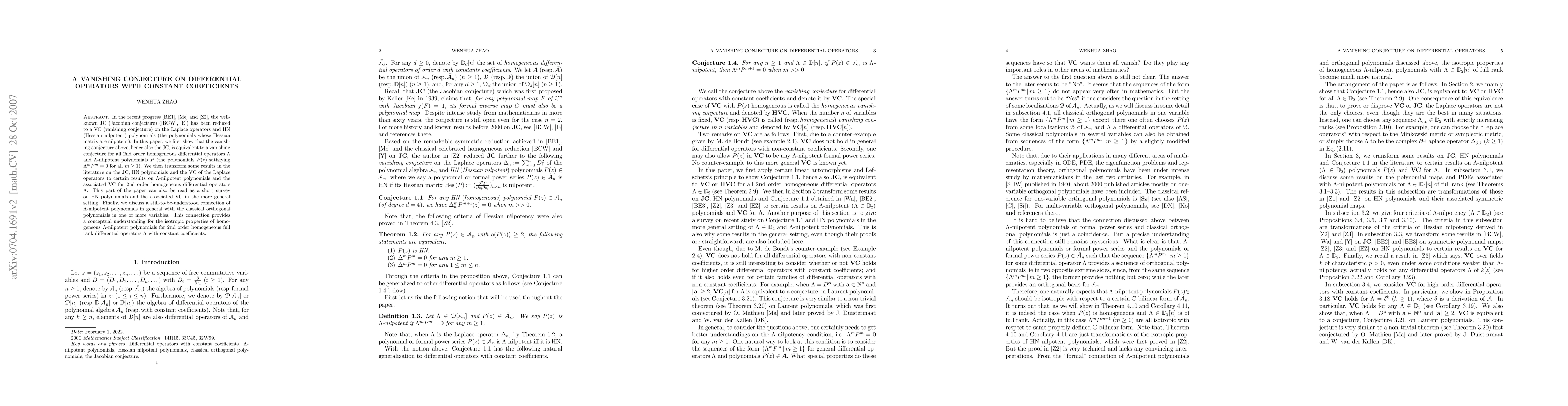 In the recent progress [BE1], [Me] and [Z2], the well-known JC (Jacobian conjecture) ([BCW], [E]) has been reduced to a VC (vanishing conjecture) on the Laplace operators and HN (Hessian nilpotent) polynomials (the polynomials whose Hessian matrix are nilpotent). In this paper, we first show that the vanishing conjecture above, hence also the JC, is equivalent to a vanishing conjecture for all 2nd order homogeneous differential operators $\Lambda$ and $\Lambda$-nilpotent polynomials $P$ (the polynomials $P(z)$ satisfying $\Lambda^m P^m=0$ for all $m\ge 1$). We then transform some results in the literature on the JC, HN polynomials and the VC of the Laplace operators to certain results on $\Lambda$-nilpotent polynomials and the associated VC for 2nd order homogeneous differential operators $\Lambda$. This part of the paper can also be read as a short survey on HN polynomials and the associated VC in the more general setting. Finally, we discuss a still-to-be-understood connection of $\Lambda$-nilpotent polynomials in general with the classical orthogonal polynomials in one or more variables. This connection provides a conceptual understanding for the isotropic properties of homogeneous $\Lambda$-nilpotent polynomials for the 2nd order homogeneous full rank differential operators $\Lambda$ with constant coefficients.
