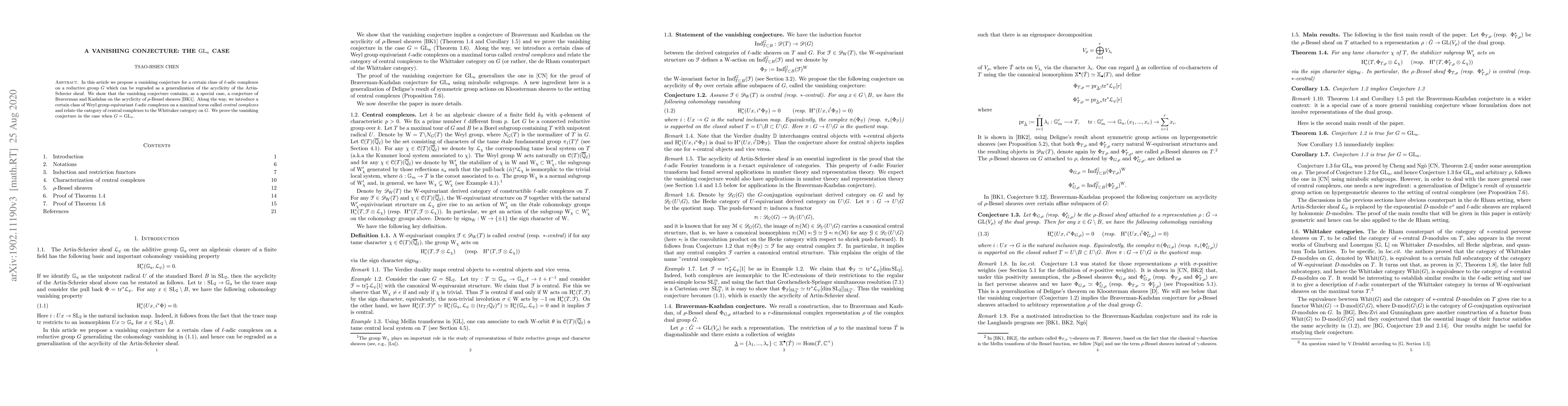 In this article we propose a vanishing conjecture for a certain class of $\ell$-adic complexes on a reductive group $G$, which can be regraded as a generalization of the acyclicity of the Artin-Schreier sheaf. We show that the vanishing conjecture contains, as a special case, a conjecture of Braverman and Kazhdan on the acyclicity of $\rho$-Bessel sheaves \cite{BK1}. Along the way, we introduce a certain class of Weyl group equivariant $\ell$-adic complexes on a maximal torus called \emph{central complexes} and relate the category of central complexes to the Whittaker category on $G$. We prove the vanishing conjecture in the case when $G=\GL_n$.
