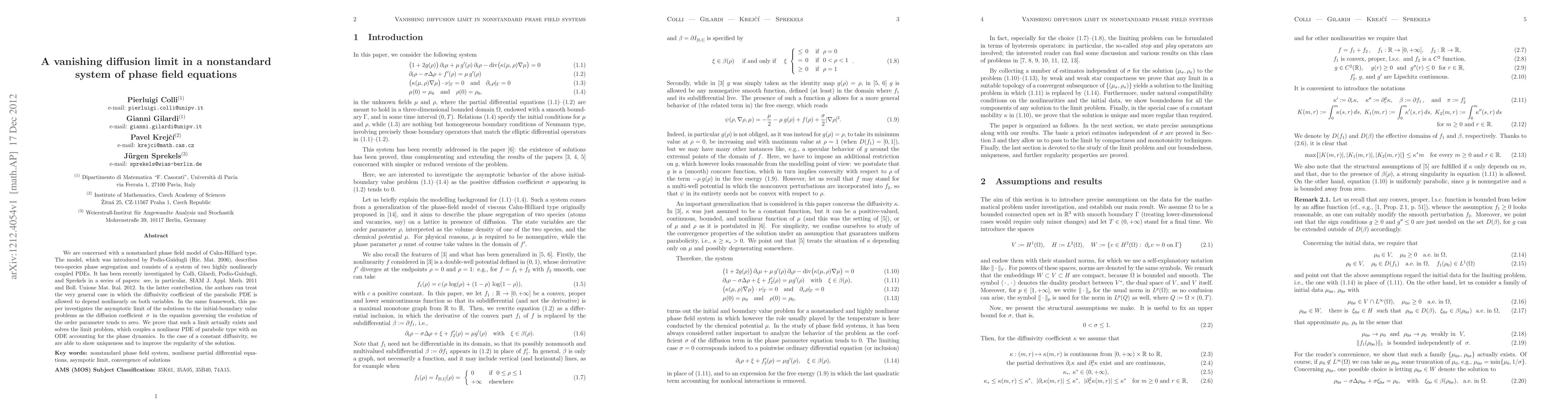 This paper examines the vanishing diffusion limit in a nonstandard phase field model of Cahn-Hilliard type, proving that the limit exists and solves a coupled nonlinear PDE and ODE system. Uniqueness and improved regularity of solutions are shown when the diffusivity is constant.