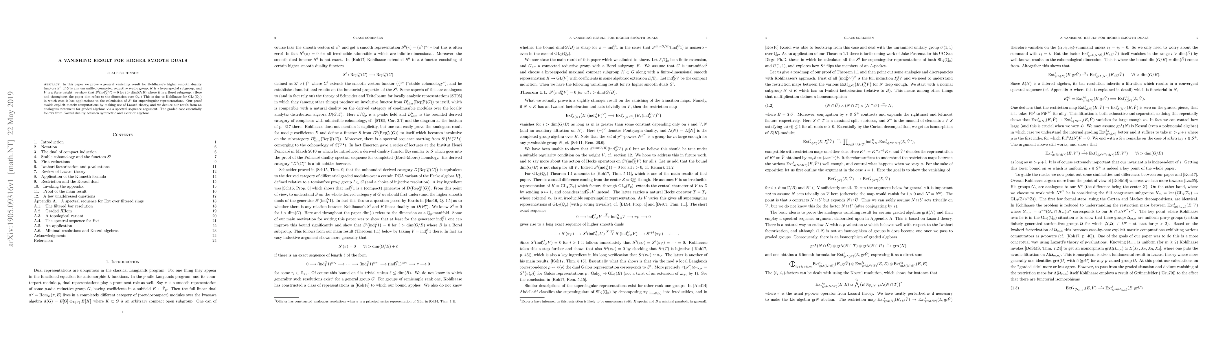 In this paper we prove a general vanishing result for Kohlhaase's higher smooth duality functors $S^i$. If $G$ is any unramified connected reductive $p$-adic group, $K$ is a hyperspecial subgroup, and $V$ is a Serre weight, we show that $S^i(\ind_K^G V)=0$ for $i>\dim(G/B)$ where $B$ is a Borel subgroup. (Here and throughout the paper $\dim$ refers to the dimension over $\Q_p$.) This is due to Kohlhaase for $\GL_2(\Q_p)$ in which case it has applications to the calculation of $S^i$ for supersingular representations. Our proof avoids explicit matrix computations by making use of Lazard theory, and we deduce our result from an analogous statement for graded algebras via a spectral sequence argument. The graded case essentially follows from Koszul duality between symmetric and exterior algebras.