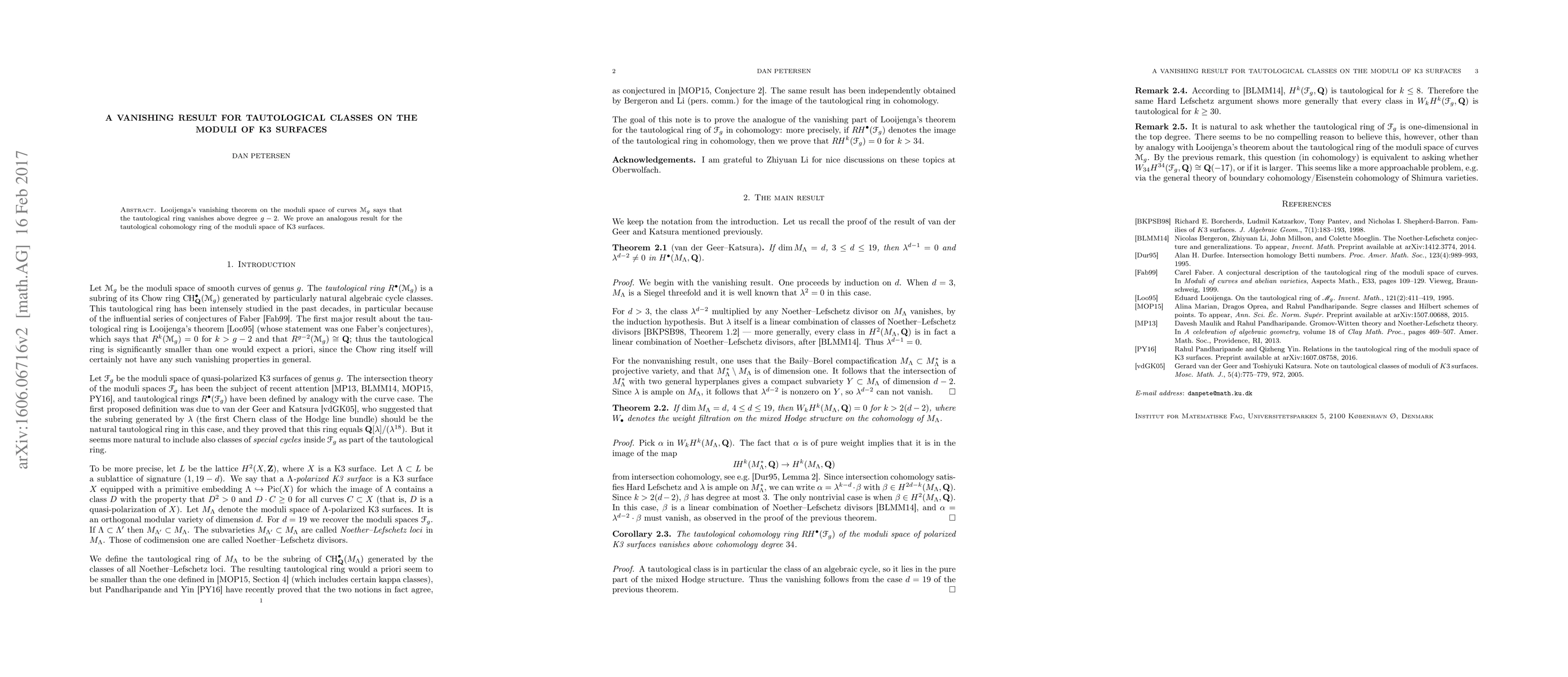 Summary: This paper proves a vanishing result for tautological classes on the moduli space of K3 surfaces, analogous to Looijenga's theorem for curves, showing that the tautological ring vanishes above a certain degree. The specific degree is determined by the properties of K3 surfaces.