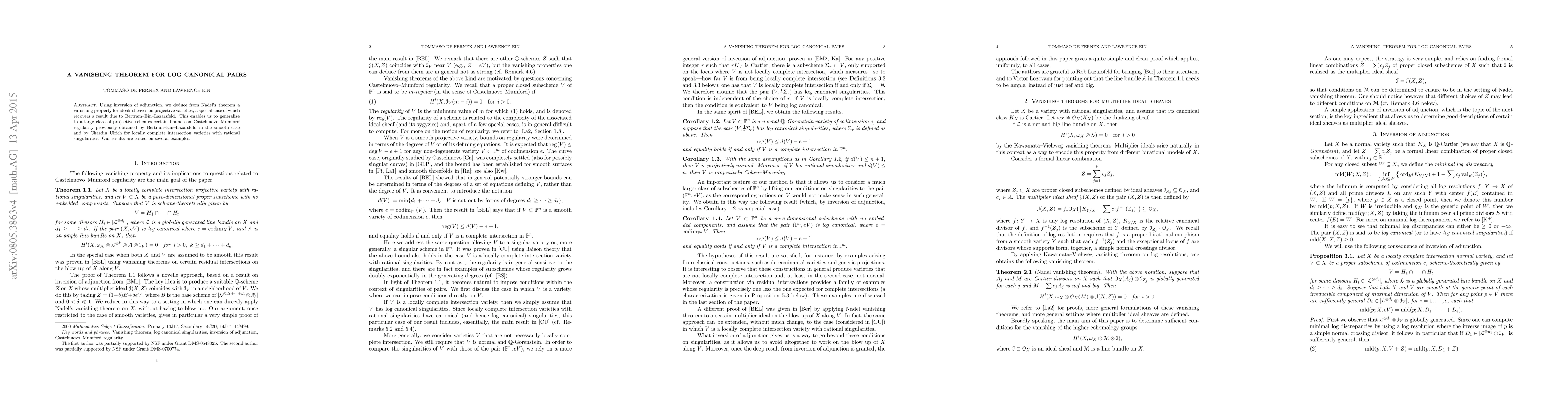 This paper establishes a vanishing theorem for log canonical pairs using inversion of adjunction and Nadel's theorem, extending bounds on Castelnuovo--Mumford regularity to a broad class of projective schemes beyond the smooth case. The results are validated through various examples.