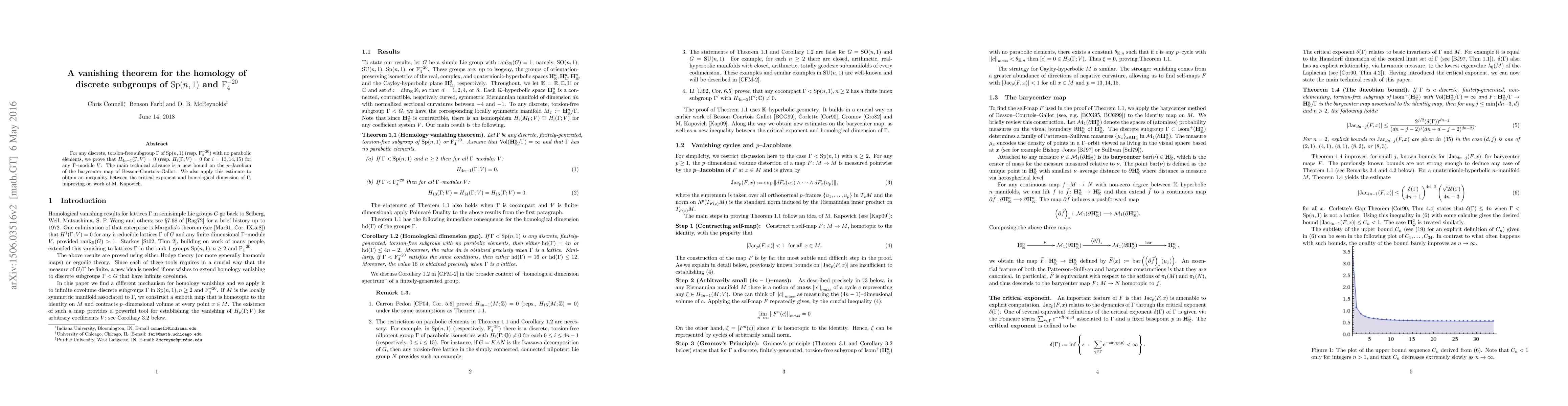 For any discrete, torsion-free subgroup $\Gamma$ of $\mathrm{Sp}(n,1)$ (resp.\ $\mathrm{F}_4^{-20}$) with no parabolic elements, we prove that $H_{4n-1}(\Gamma;V)=0$ (resp.\ $H_i(\Gamma;V)=0$ for $i=13,14,15$) for any $\Gamma$--module $V$. The main technical advance is a new bound on the $p$--Jacobian of the barycenter map of Besson--Courtois--Gallot. We also apply this estimate to obtain an inequality between the critical exponent and homological dimension of $\Gamma$, improving on work of M.~Kapovich.