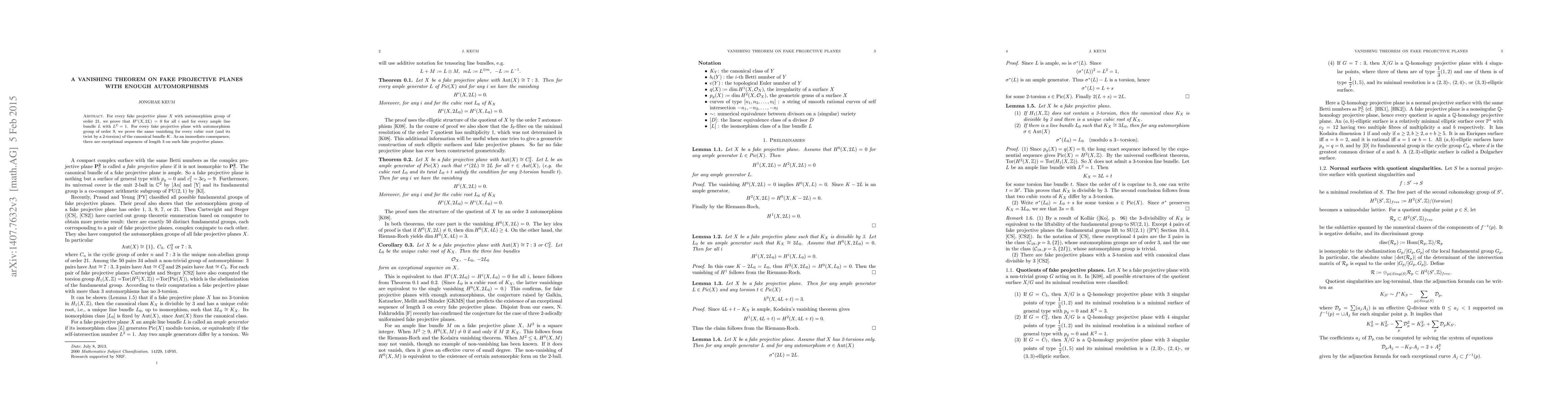 This paper proves vanishing theorems for cohomology groups of fake projective planes with specific automorphism groups, showing that certain line bundles yield zero cohomology for all degrees. It also establishes the existence of exceptional sequences of length 3 on these planes.