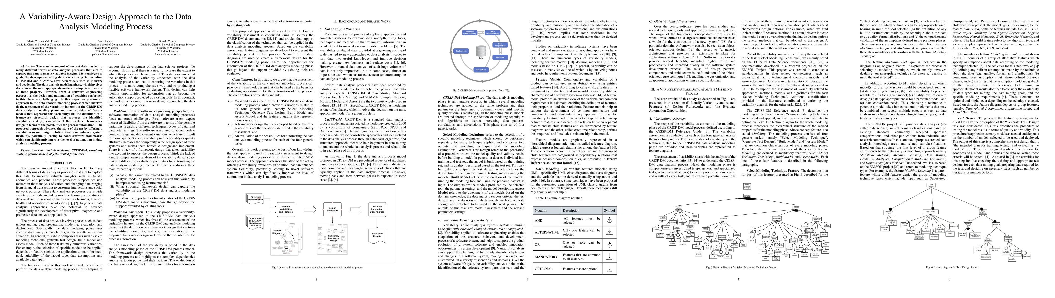 The massive amount of current data has led to many different forms of data analysis processes that aim to explore this data to uncover valuable insights. Methodologies to guide the development of big data science projects, including CRISP-DM and SEMMA, have been widely used in industry and academia. The data analysis modeling phase, which involves decisions on the most appropriate models to adopt, is at the core of these projects. However, from a software engineering perspective, the design and automation of activities performed in this phase are challenging. In this paper, we propose an approach to the data analysis modeling process which involves (i) the assessment of the variability inherent in the CRISP-DM data analysis modeling phase and the provision of feature models that represent this variability; (ii) the definition of a framework structural design that captures the identified variability; and (iii) evaluation of the developed framework design in terms of the possibilities for process automation. The proposed approach advances the state of the art by offering a variability-aware design solution that can enhance system flexibility, potentially leading to novel software frameworks which can significantly improve the level of automation in data analysis modeling process.