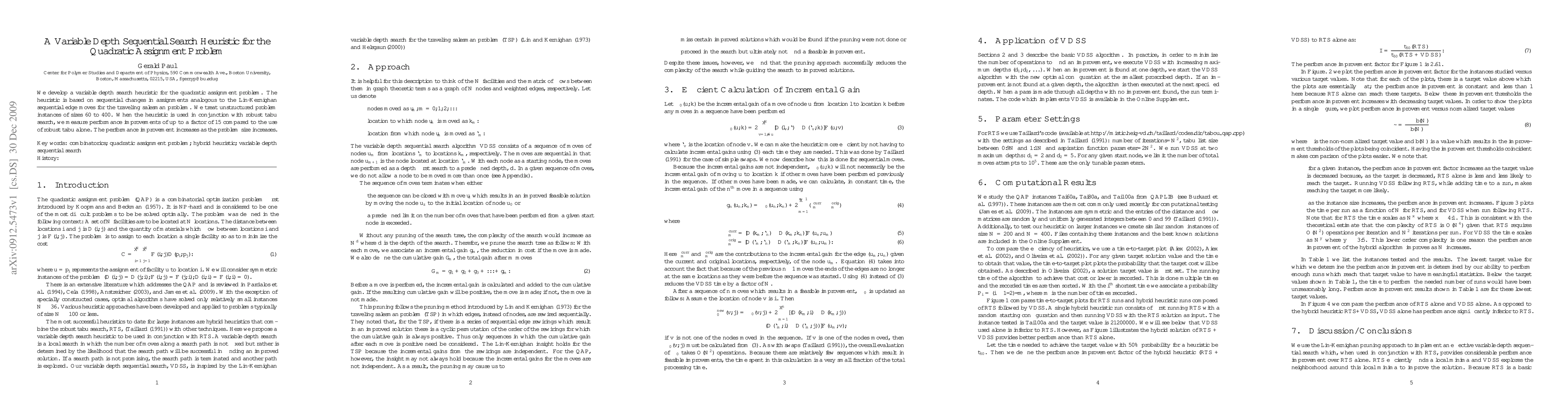 This paper proposes a variable depth sequential search heuristic for solving the quadratic assignment problem, achieving significant performance improvements when combined with tabu search, especially for larger problem sizes. The heuristic shows up to a 15-fold improvement over tabu search alone.