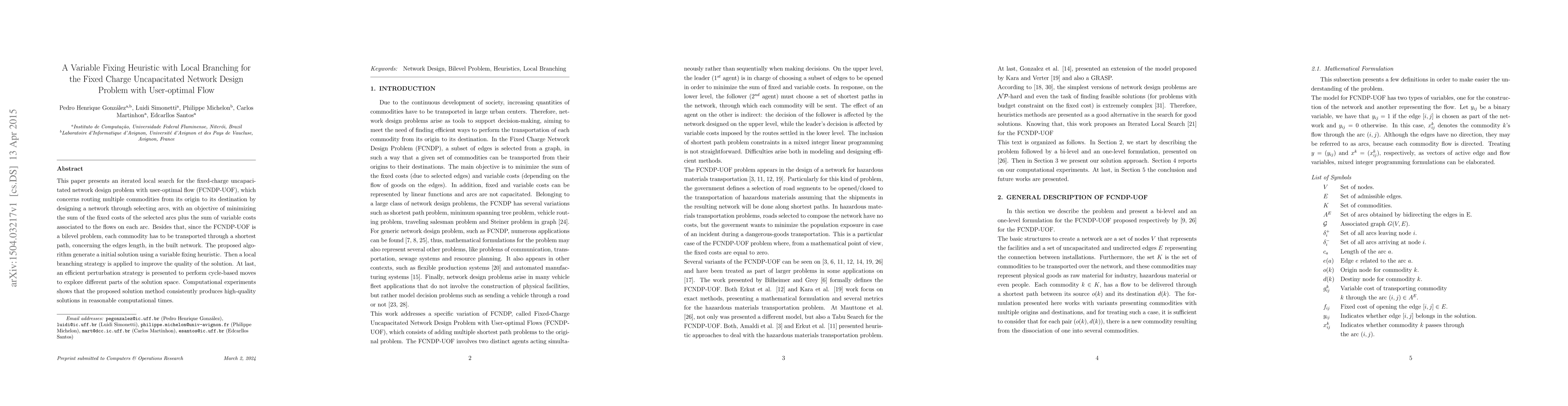 This paper proposes a new algorithm for the fixed-charge uncapacitated network design problem with user-optimal flow, using an iterated local search approach that improves solution quality through local branching and perturbation strategies.