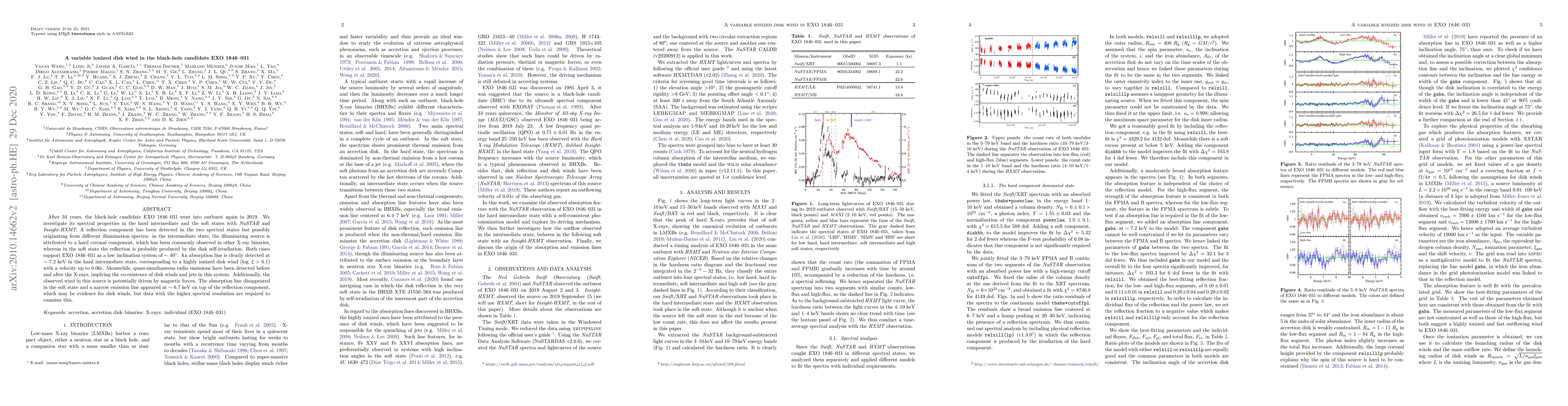 This study investigates the spectral properties of the black-hole candidate EXO 1846-031 during its 2019 outburst, revealing a variable ionized disk wind. The hard intermediate state shows a highly ionized wind with velocities up to 0.06c, while the soft state exhibits disk self-irradiation and potential evidence for disk winds.