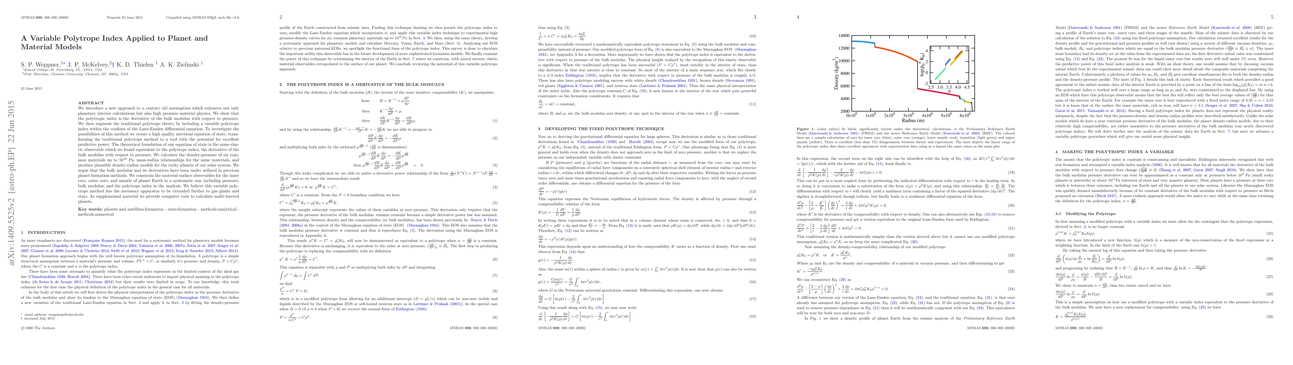 We introduce a new approach to a century old assumption which enhances not only planetary interior calculations but also high pressure material physics. We show that the polytropic index is the derivative of the bulk modulus with respect to pressure. We then augment the traditional polytrope theory by including a variable polytrope index within the confines of the Lane-Emden differential equation. To investigate the possibilities of this method we create a high quality universal equation of state, transforming the traditional polytrope method to a tool with the potential for excellent predictive power. The theoretical foundation of our equation of state is the same elastic observable which we found equivalent to the polytrope index, the derivative of the bulk modulus with respect to pressure. We calculate the density-pressure of six common materials up to 10$^{18}$ Pa, mass-radius relationships for the same materials, and produce plausible density-radius models for the rocky planets of our solar system. We argue that the bulk modulus and its derivatives have been under utilized in previous planet formation methods. We constrain the material surface observables for the inner core, outer core, and mantle of planet Earth in a systematic way including pressure, bulk modulus, and the polytrope index in the analysis. We believe this variable polytrope method has the necessary apparatus to be extended further to gas giants and stars. As supplemental material we provide computer code to calculate multi-layered planets.