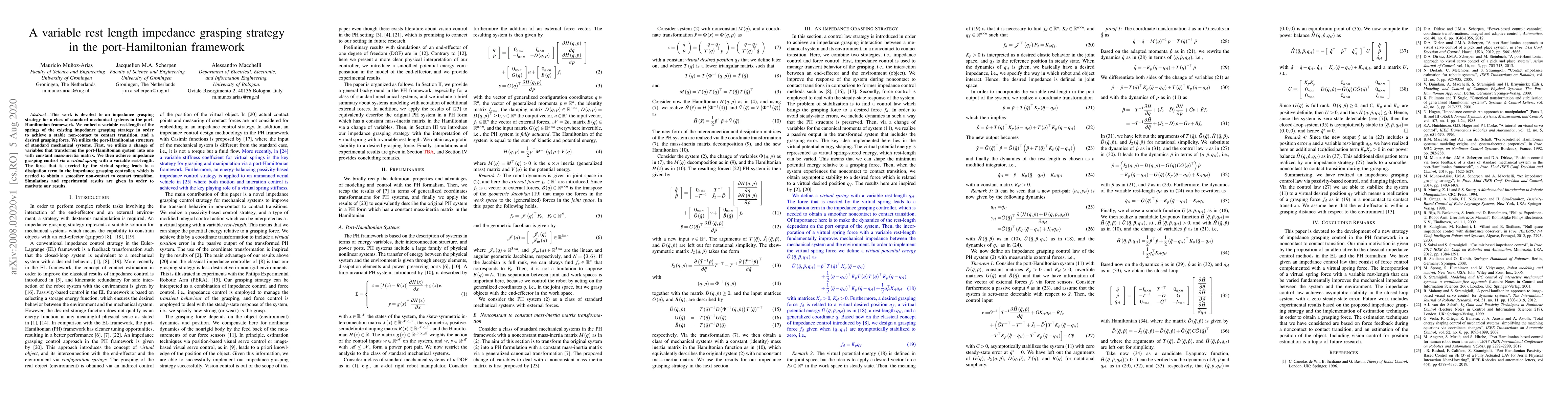 This work is devoted to an impedance grasping strategy for a class of standard mechanical systems in the port-Hamiltonian framework. We embed a variable rest-length of the springs of the existing impedance grasping strategy in order to achieve a stable non-contact to contact transition, and a desired grasping force. We utilize the port-Hamiltonian structure of standard mechanical systems. First, we utilize a change of variables that transforms the port-Hamiltonian system into one with a constant mass-inertia matrix. We then achieve impedance grasping control via a \emph{virtual spring} with a variable rest-length. The force that is exerted by the virtual spring leads to a dissipation term in the impedance grasping controller, which is needed to obtain a smoother non-contact to contact transition. Simulations and experimental results are given in order to motivate our results.