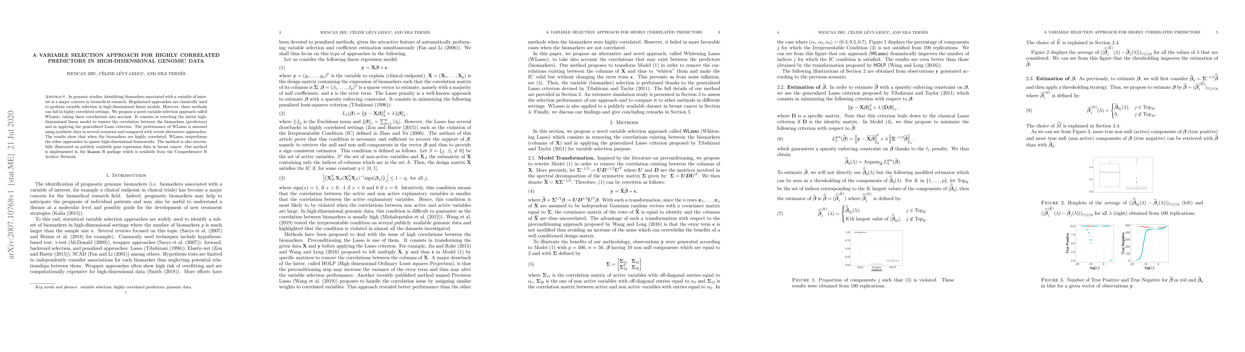This paper proposes a novel variable selection method called WLasso for high-dimensional genomic data with highly correlated predictors. The method rewrites the initial model to eliminate correlations and applies the generalized Lasso criterion, outperforming other approaches in correlated settings and demonstrated on breast cancer gene expression data.