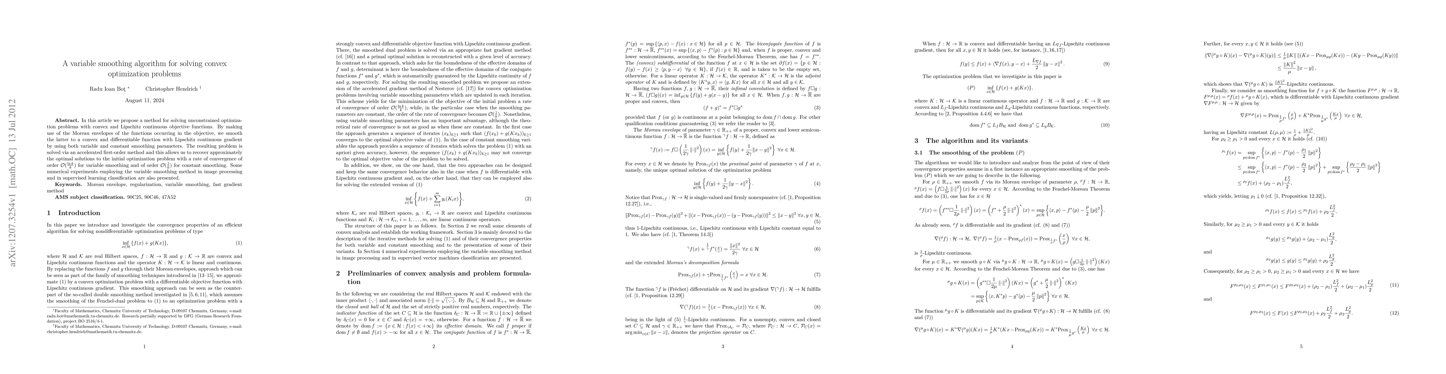 This paper proposes a variable smoothing algorithm for solving convex optimization problems by smoothing objective functions using Moreau envelopes, and solves it via an accelerated first-order method. The method achieves convergence rates of $\O(\tfrac{\ln k}{k})$ for variable smoothing and $\O(\tfrac{1}{k})$ for constant smoothing, demonstrated through applications in image processing and classification.