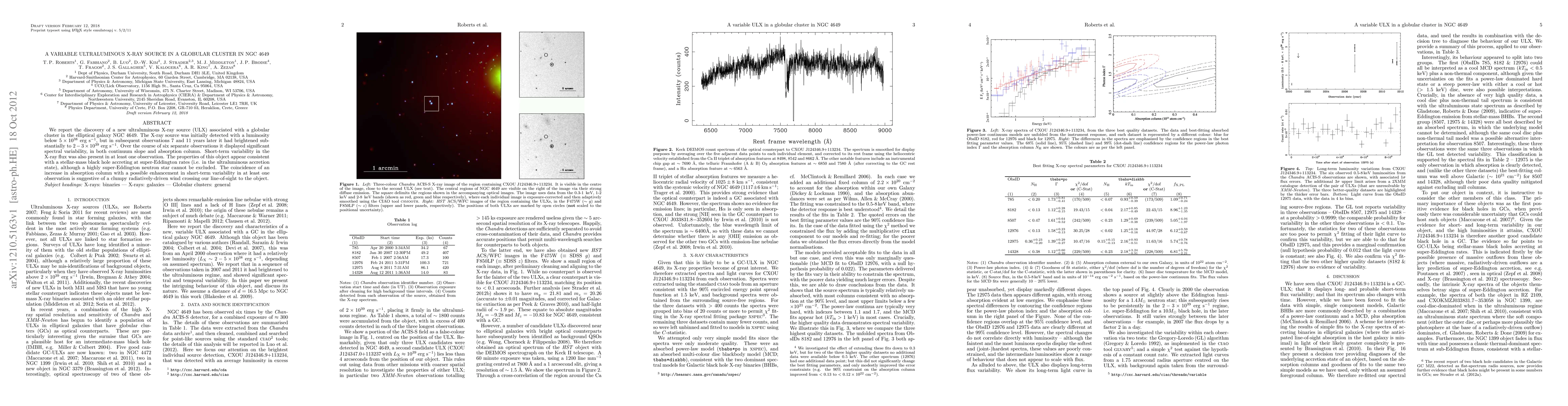 This paper reports the discovery of a variable ultraluminous X-ray source in NGC 4649's globular cluster, which brightened significantly over time and exhibited spectral variability, suggesting it may be a stellar-mass black hole accreting at super-Eddington rates or a highly super-Eddington neutron star.