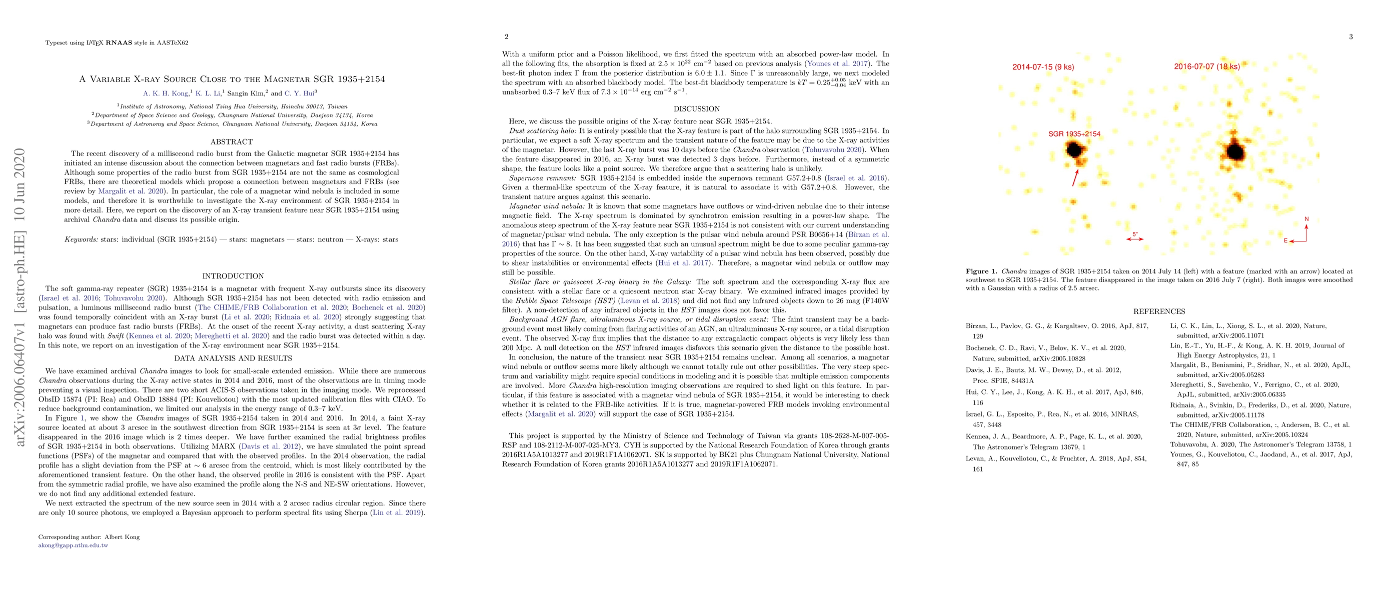 This paper reports the discovery of a variable X-ray source near the magnetar SGR 1935+2154 using archival Chandra data, sparking discussions on the potential link between magnetars and fast radio bursts, and explores its possible origins.
