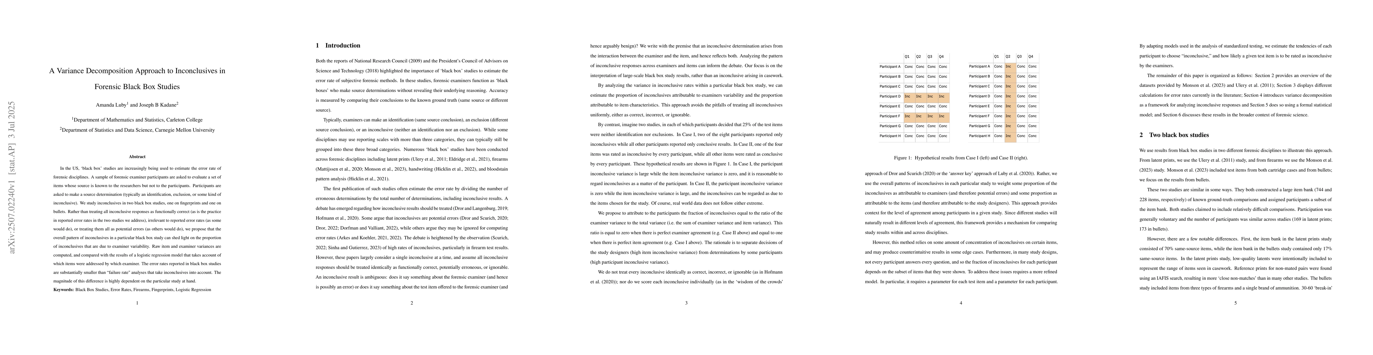 This research proposes a variance decomposition approach to analyze inconclusives in forensic black box studies on fingerprints and bullets. It suggests that the pattern of inconclusives can reveal the proportion due to examiner variability, contrasting with existing methods. The study finds that reported error rates from black box studies are significantly lower than 'failure rate' analyses considering inconclusives, with the difference's magnitude varying per study.