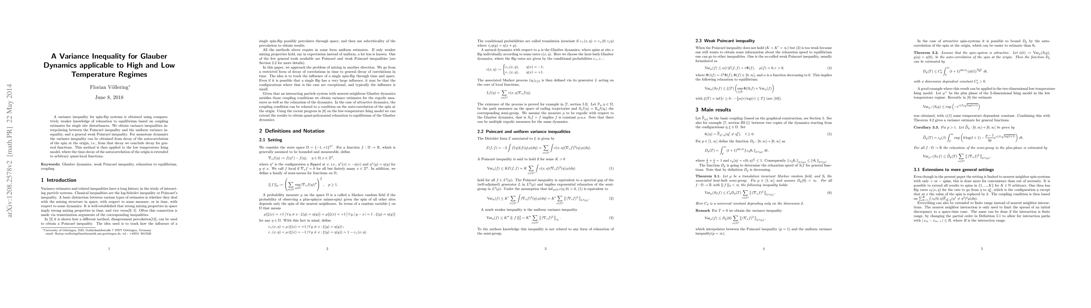 This research paper develops a variance inequality for Glauber dynamics that applies to both high and low temperature regimes, enabling the study of spin-flip systems with weaker knowledge of relaxation to equilibrium.