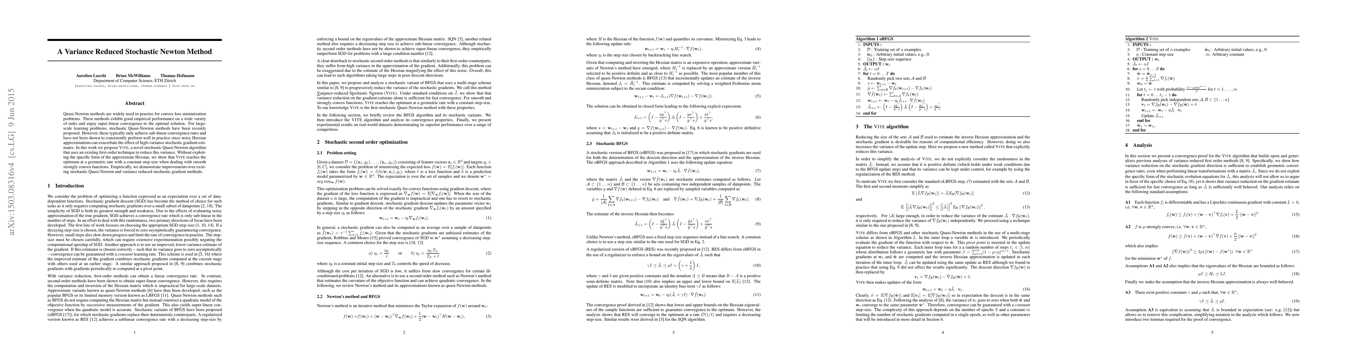 Title: A Variance Reduced Stochastic Newton Method Abstract: This paper introduces Vite, a novel stochastic Quasi-Newton method that leverages first-order techniques to reduce variance, achieving geometric convergence rates for smooth strongly convex functions. Empirically, Vite outperforms existing stochastic Quasi-Newton and variance reduced gradient methods.
