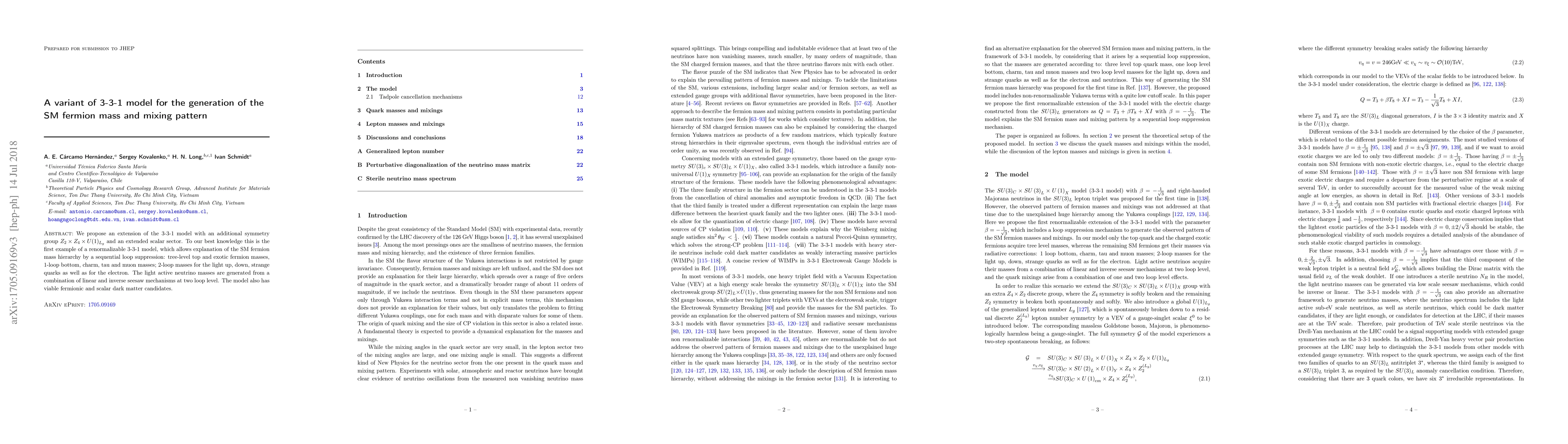 We propose an extension of the 3-3-1 model with an additional symmetry group $Z_{2}\times Z_{4} \times U(1)_{L_g}$ and an extended scalar sector. To our best knowledge this is the first example of a renormalizable 3-3-1 model, which allows explanation of the SM fermion mass hierarchy by a sequential loop suppression: tree-level top and exotic fermion masses, 1-loop bottom, charm, tau and muon masses; 2-loop masses for the light up, down, strange quarks as well as for the electron. The light active neutrino masses are generated from a combination of linear and inverse seesaw mechanisms at two loop level. The model also has viable fermionic and scalar dark matter candidates.