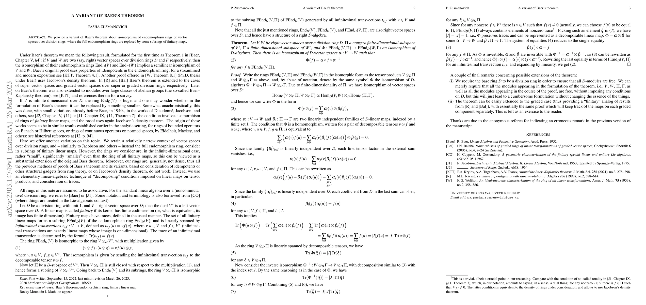 Summary: This paper presents a modified version of Baer's theorem, focusing on the isomorphism of endomorphism rings of vector spaces over division rings, but using subrings of finitary maps instead of the full endomorphism rings.