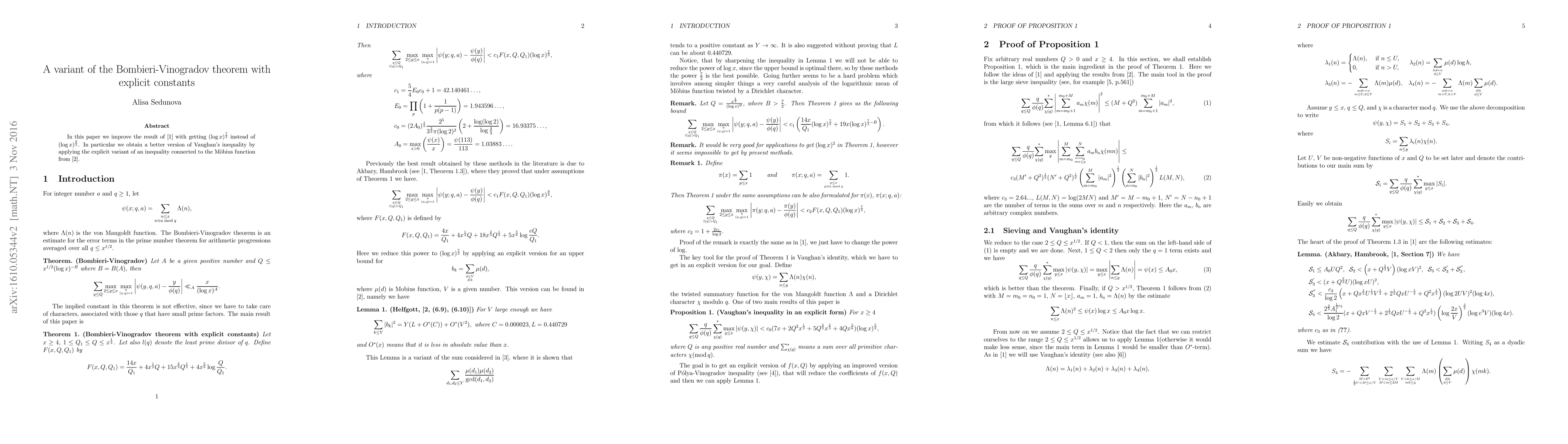 This paper enhances the Bombieri-Vinogradov theorem by a logarithmic factor, leveraging an improved version of Vaughan's inequality and an explicit inequality related to the Möbius function, which was originally developed by Helfgott for the ternary Goldbach conjecture.