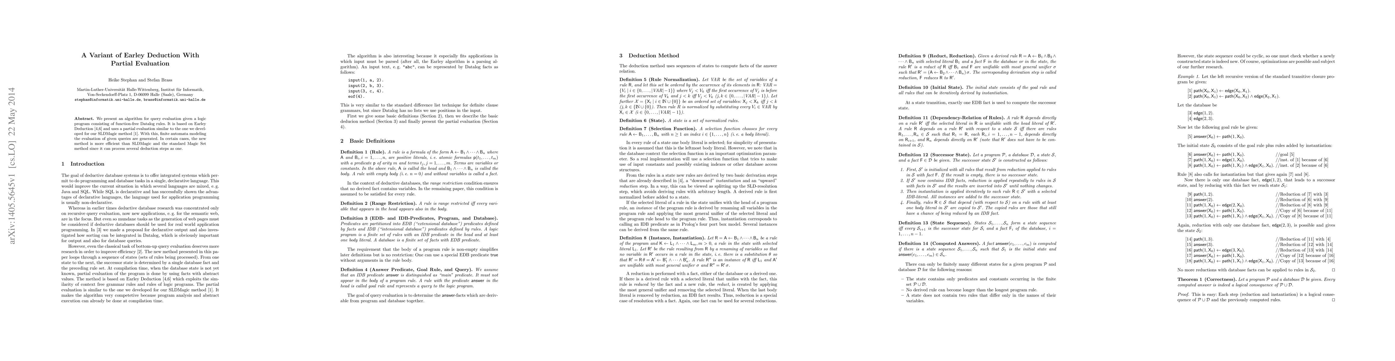 This paper introduces an algorithm for query evaluation in function-free Datalog programs, leveraging Earley Deduction and partial evaluation techniques. The new method can outperform existing approaches like SLDMagic and the Magic Set method by processing multiple deduction steps simultaneously.