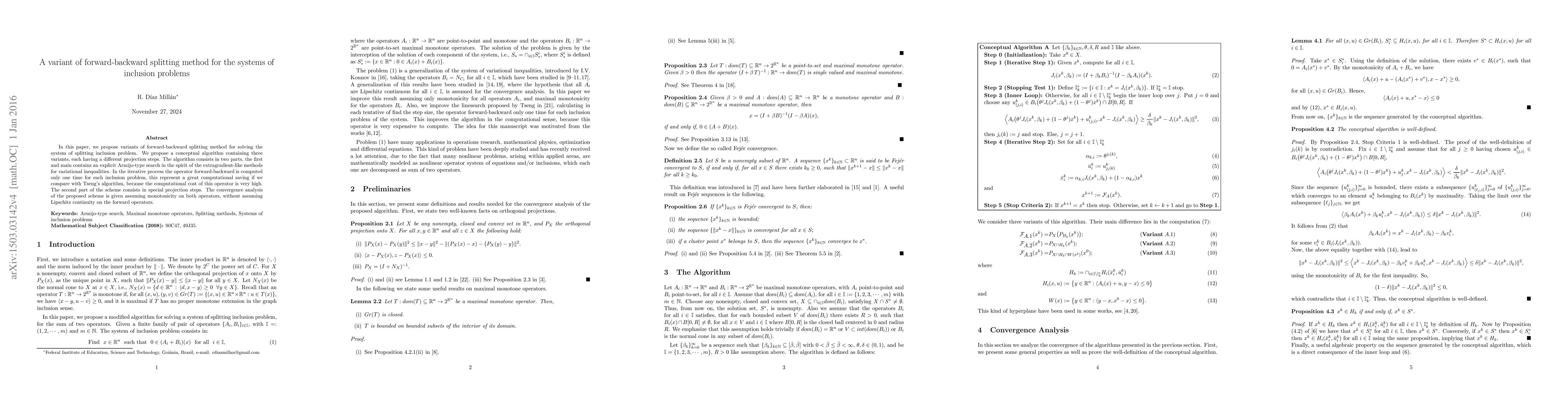 In this paper, we propose variants of forward-backward splitting method for solving the system of splitting inclusion problem. We propose a conceptual algorithm containing three variants, each having a different projection steps. The algorithm consists in two parts, the first and main contains an explicit Armijo-type search in the spirit of the extragradient-like methods for variational inequalities. In the iterative process the operator forward-backward is computed only one time for each inclusion problem, this represent a great computational saving if we compare with Tseng's algorithm, because the computational cost of this operator is very high. The second part of the scheme consists in special projection steps. The convergence analysis of the proposed scheme is given assuming monotonicity on both operators, without assuming Lipschitz continuity on the forward operators.