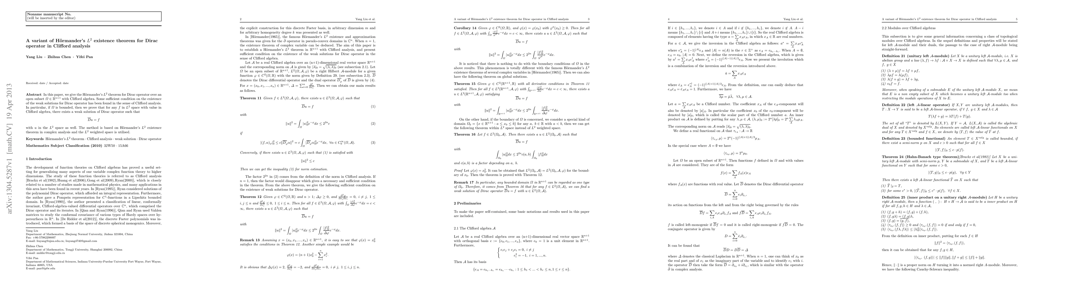 The research provides a new variant of H"ormander's $L^2$ theorem for Dirac operator in Clifford analysis, with significant technical contributions.