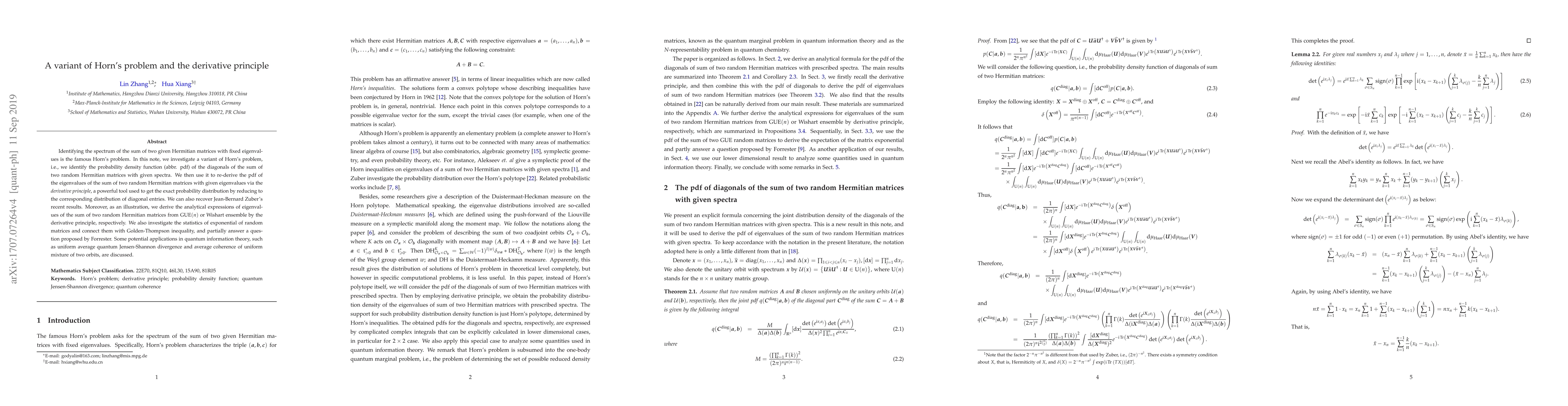 This paper explores a variant of Horn's problem, focusing on the probability density function of the diagonals of the sum of two random Hermitian matrices with specified spectra, and uses the derivative principle to derive the eigenvalues' distribution. It connects the results to quantum information theory applications and investigates the statistics of the exponential of random matrices.