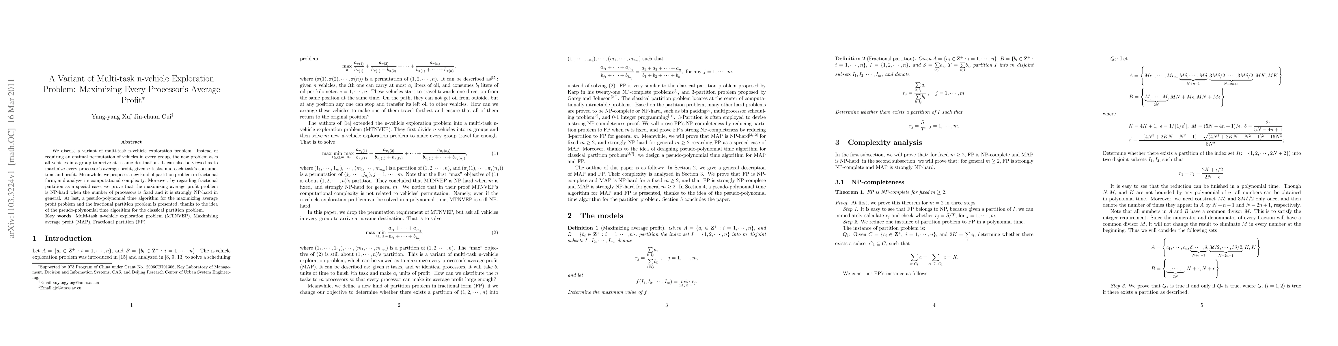 We discuss a variant of multitask n-vehicle exploration problem. Instead of requiring an optimal permutation of vehicles in every group, the new problem asks all vehicles in a group to arrive at a same destination. It can also be viewed as to maximize every processor's average profit, given n tasks, and each task's consume-time and profit. Meanwhile, we propose a new kind of partition problem in fractional form, and analyze its computational complexity. Moreover, by regarding fractional partition as a special case, we prove that the maximizing average profit problem is NP-hard when the number of processors is fixed and it is strongly NP-hard in general. At last, a pseudo-polynomial time algorithm for the maximizing average profit problem and the fractional partition problem is presented, thanks to the idea of the pseudo-polynomial time algorithm for the classical partition problem.