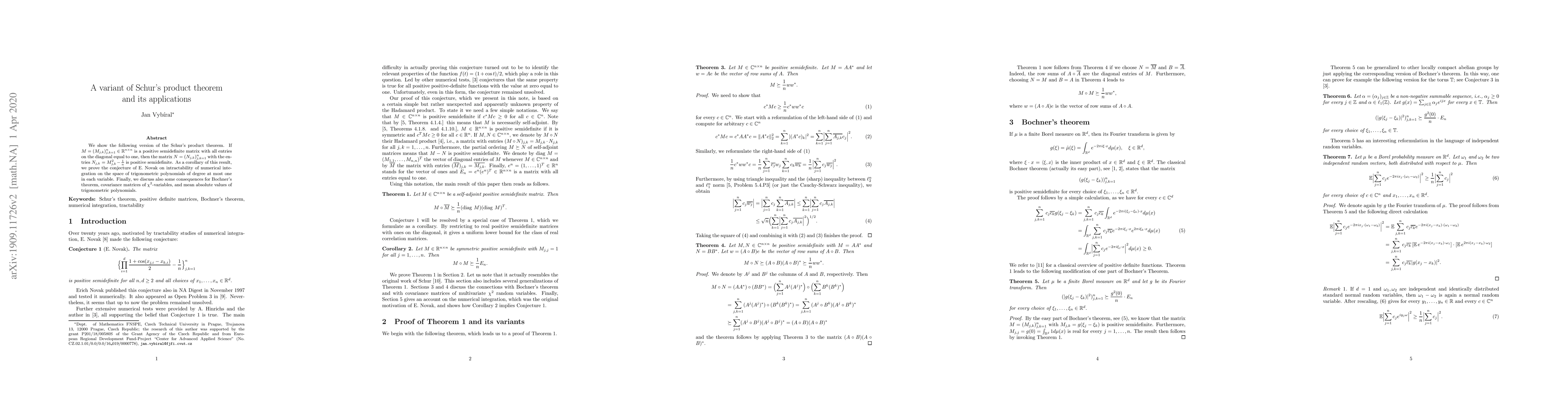 We show the following version of the Schur's product theorem. If $M=(M_{j,k})_{j,k=1}^n\in{\mathbb R}^{n\times n}$ is a positive semidefinite matrix with all entries on the diagonal equal to one, then the matrix $N=(N_{j,k})_{j,k=1}^n$ with the entries $N_{j,k}=M_{j,k}^2-\frac{1}{n}$ is positive semidefinite. As a corollary of this result, we prove the conjecture of E. Novak on intractability of numerical integration on a space of trigonometric polynomials of degree at most one in each variable. Finally, we discuss also some consequences for Bochner's theorem, covariance matrices of $\chi^2$-variables, and mean absolute values of trigonometric polynomials. -- Please, have a look into page 6 of the preprint "Lower Bounds for the Error of Quadrature Formulas for Hilbert Spaces" for a discussion of the relation of Theorem 1 and Corollary 2 to Gegenbauer polynomials (pointed out by Dmitriy Bilyk (University of Minnesota)). --