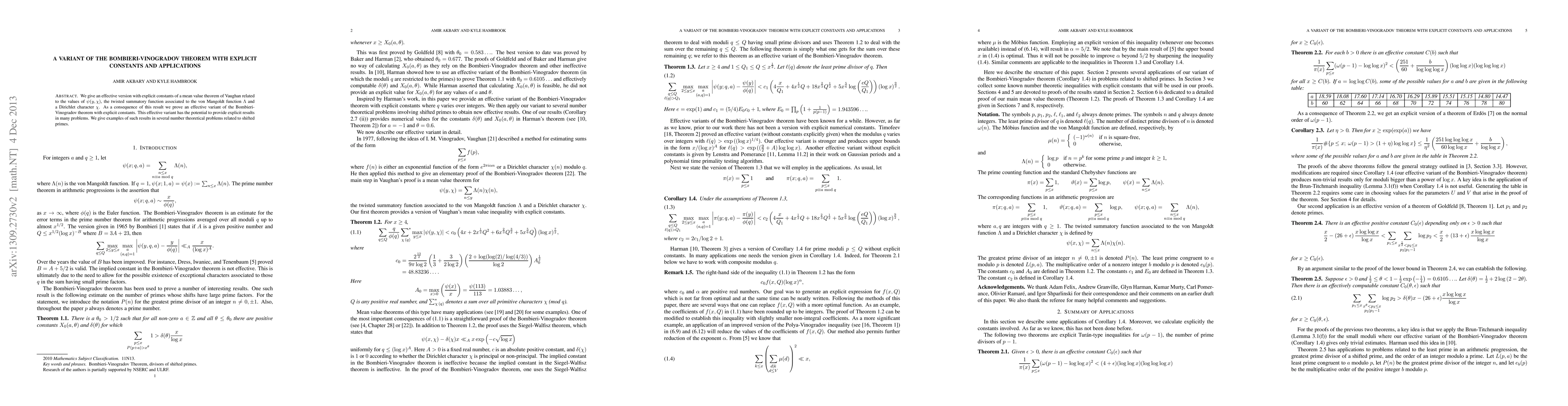 We give an effective version with explicit constants of a mean value theorem of Vaughan related to the values of \psi(y, \chi), the twisted summatory function associated to the von Mangoldt function \Lambda and a Dirichlet character \chi. As a consequence of this result we prove an effective variant of the Bombieri-Vinogradov theorem with explicit constants. This effective variant has the potential to provide explicit results in many problems. We give examples of such results in several number theoretical problems related to shifted primes.