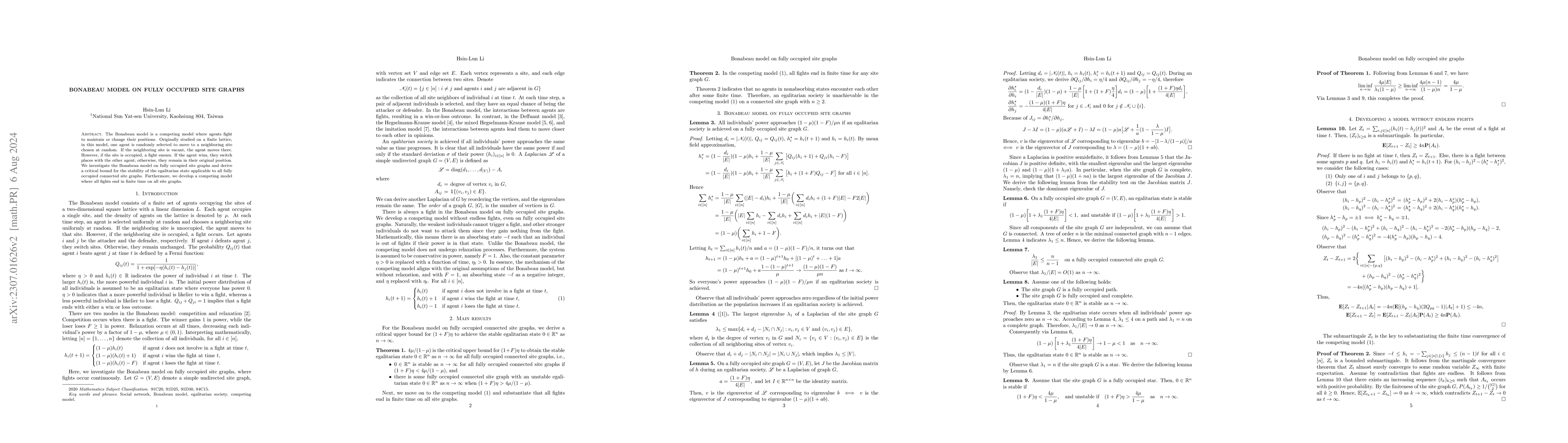 The Bonabeau model consists of a finite number of agents, each of which occupies only one site on a square lattice. One agent is randomly selected and chooses a neighboring site at random. If the neighboring site is vacant, the agent moves to that site. However, if the site is occupied, a fight is triggered. If the agent wins the fight, the two agents switch sites. Otherwise, they remain in their original position. We consider a variant of the Bonabeau model where the initial number of wins for all agents is distributed between two absorbing states. We study various properties of the model, including finite-time convergence. We demonstrate that achieving an egalitarian society is impossible and explore the circumstances under which the number of clusters in the distribution of wins of all agents is either two or more than two.