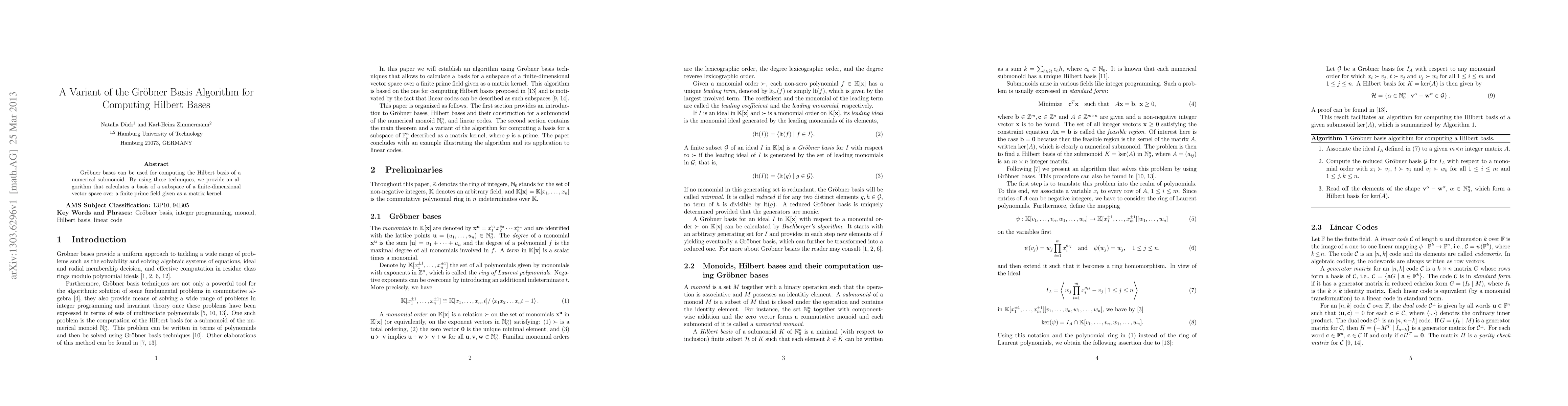 This paper presents a novel variant of the Gr\"obner basis algorithm to compute Hilbert bases for numerical submonoids, specifically for determining a basis of the kernel of a matrix representing a subspace over a finite prime field. The method enhances computational efficiency in this context.