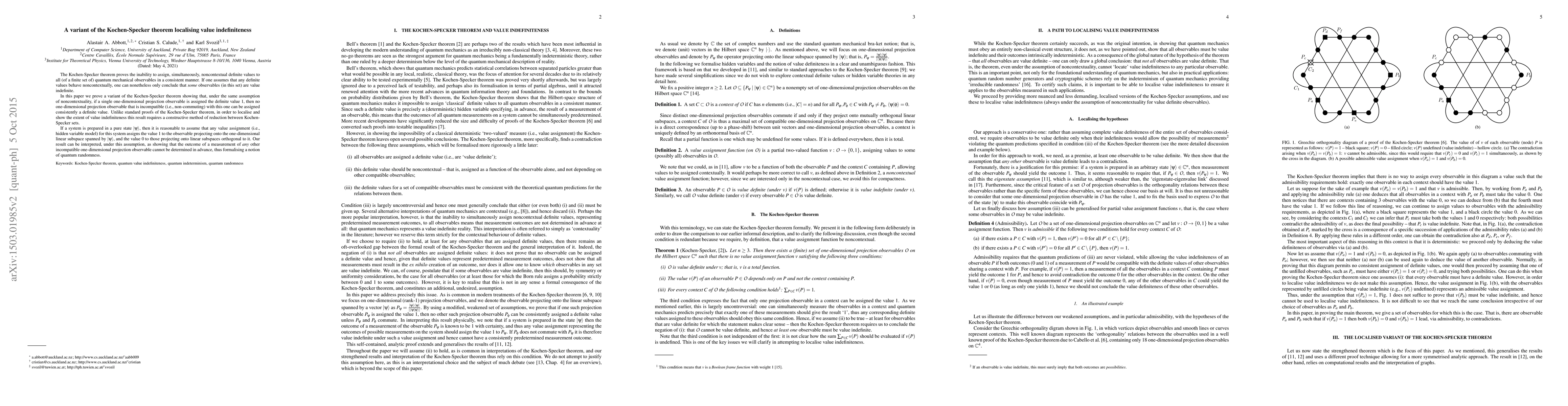 This paper proves a variant of the Kochen-Specker theorem, demonstrating that assigning a definite value of 1 to a single one-dimensional projection observable in a noncontextual manner precludes assigning consistent definite values to any incompatible one-dimensional projection observables. This variant localizes value indefiniteness and formalizes quantum randomness.