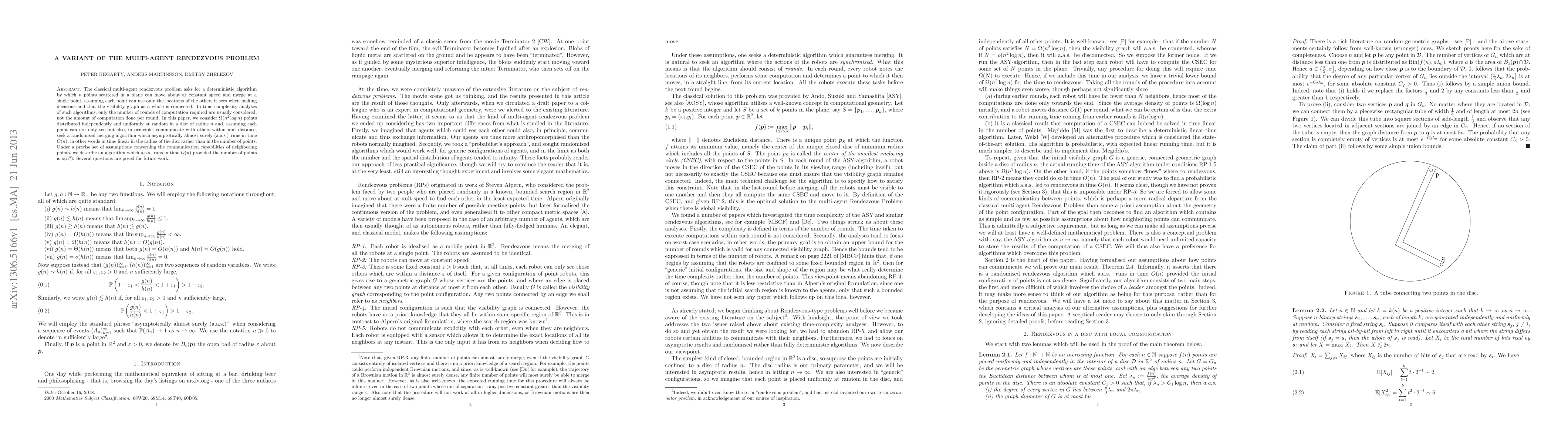 The classical multi-agent rendezvous problem asks for a deterministic algorithm by which $n$ points scattered in a plane can move about at constant speed and merge at a single point, assuming each point can use only the locations of the others it sees when making decisions and that the visibility graph as a whole is connected. In time complexity analyses of such algorithms, only the number of rounds of computation required are usually considered, not the amount of computation done per round. In this paper, we consider $\Omega(n^2 \log n)$ points distributed independently and uniformly at random in a disc of radius $n$ and, assuming each point can not only see but also, in principle, communicate with others within unit distance, seek a randomised merging algorithm which asymptotically almost surely (a.a.s.) runs in time O(n), in other words in time linear in the radius of the disc rather than in the number of points. Under a precise set of assumptions concerning the communication capabilities of neighboring points, we describe an algorithm which a.a.s. runs in time O(n) provided the number of points is $o(n^3)$. Several questions are posed for future work.