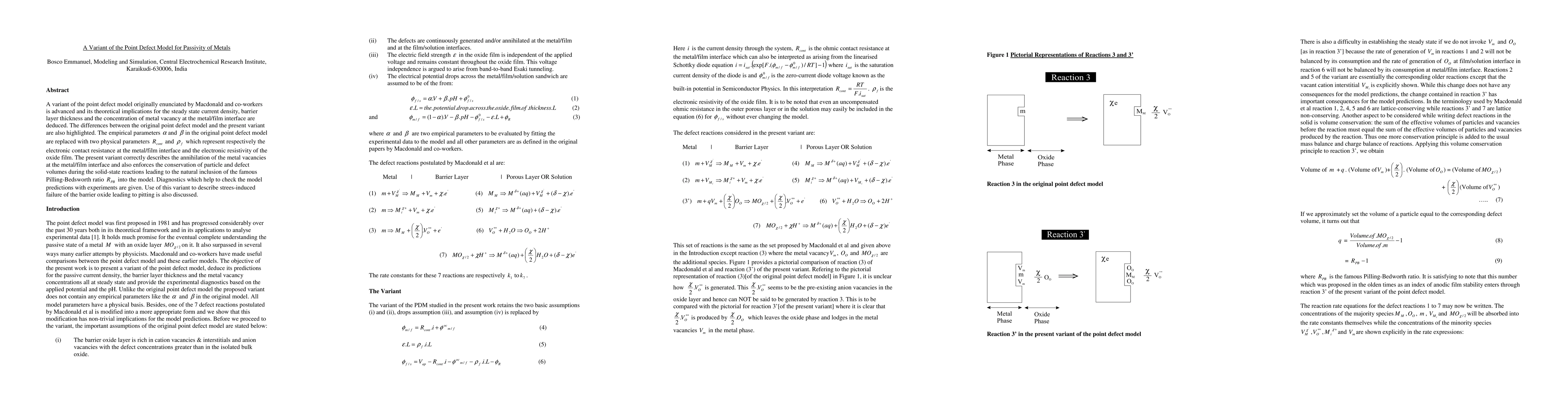 A variant of the point defect model originally enunciated by Macdonald and co-workers is advanced and its theoretical implications for the steady state current density, barrier layer thickness and the concentration of metal vacancy at the metal/film interface are deduced. The differences between the original point defect model and the present variant are also highlighted. The empirical parameters alpha and beta in the original point defect model are replaced with two physical parameters Rcont and Rhof which represent respectively the electronic contact resistance at the metal/film interface and the electronic resistivity of the oxide film. The present variant correctly describes the annihilation of the metal vacancies at the metal/film interface and also enforces the conservation of particle and defect volumes during the solid-state reactions leading to the natural inclusion of the famous Pilling-Bedsworth ratio RPB into the model. Diagnostics which help to check the model predictions with experiments are given. Use of this variant to describe stress-induced failure of the barrier oxide leading to pitting is also discussed.