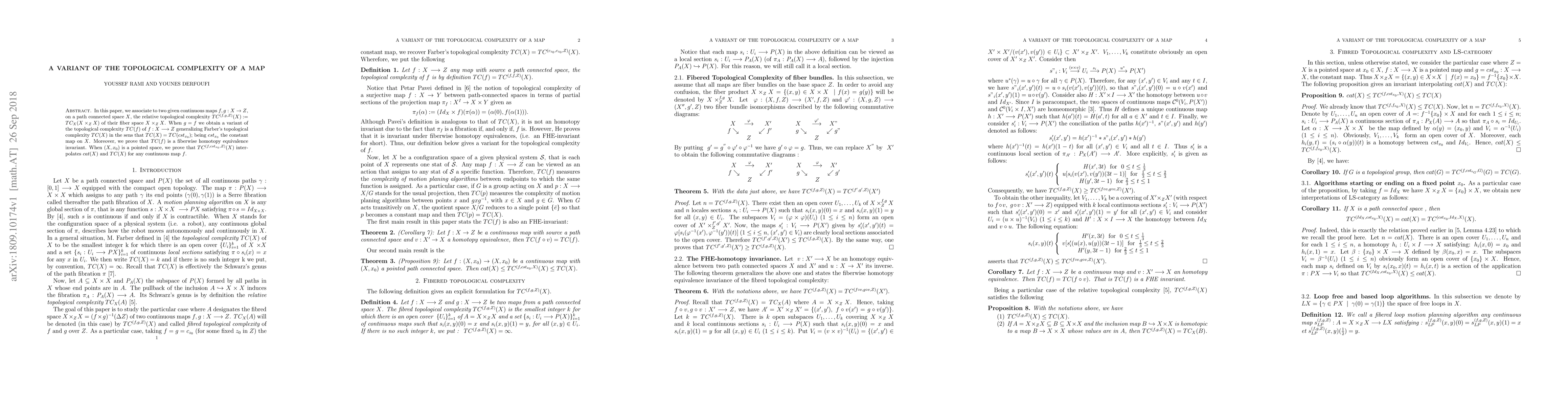 In this paper, we associate to two given continuous maps $f,g: X\rightarrow Z$, on a path connected space $X$, the relative topological complexity $TC^{(f, g, Z)}(X):=TC_X(X\times _ZX)$ of their fiber space $X\times _ZX$. When $g=f$ we obtain a variant of the topological complexity $TC(f)$ of $f: X\longrightarrow Z$ generalizing Farber's topological complexity $TC(X)$ in the sens that $TC(X)=TC(cst_{x_0})$; being $cst_{x_0}$ the constant map on $X$. Moreover, we prove that $TC(f)$ is a fiberwise homotopy equivalence invariant. When $(X,x_0)$ is a pointed space, we prove that $TC^{(f, cst_{x_0}, Z)}(X)$ interpolates $cat(X)$ and $TC(X)$ for any continuous map $f$.