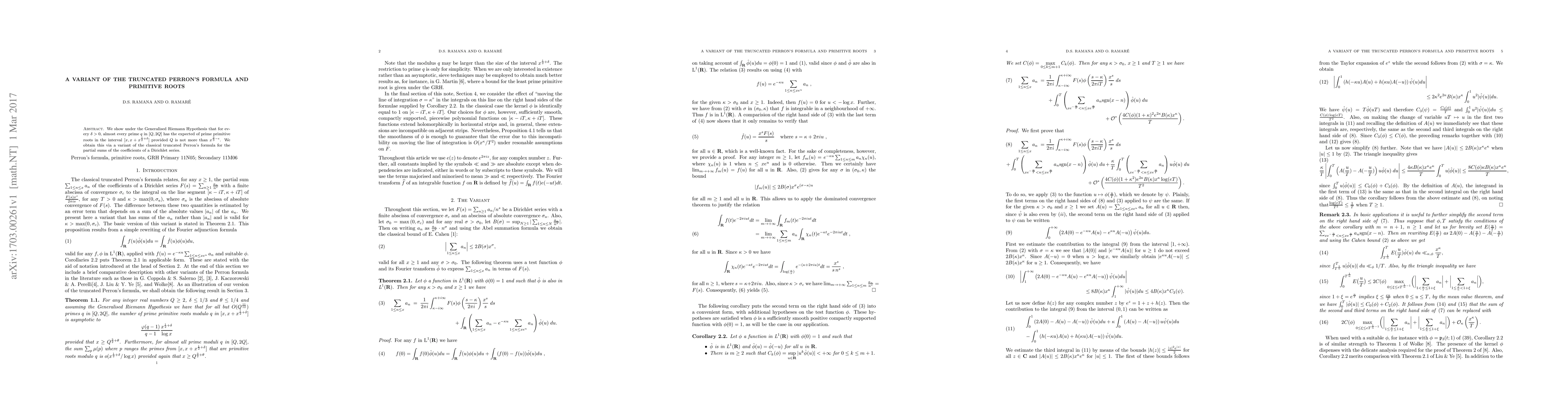 We show under the Generalised Riemann Hypothesis that for every $\delta>0$, almost every prime $q$ in $[Q,2Q]$ has the expected of prime primitive roots in the interval $[x,x+x^{\frac{1}2+\delta}]$ provided $Q$ is not more than $x^{\frac{2}{3}-\epsilon}$. We obtain this via a variant of the classical truncated Perron's formula for the partial sums of the coefficients of a Dirichlet series.