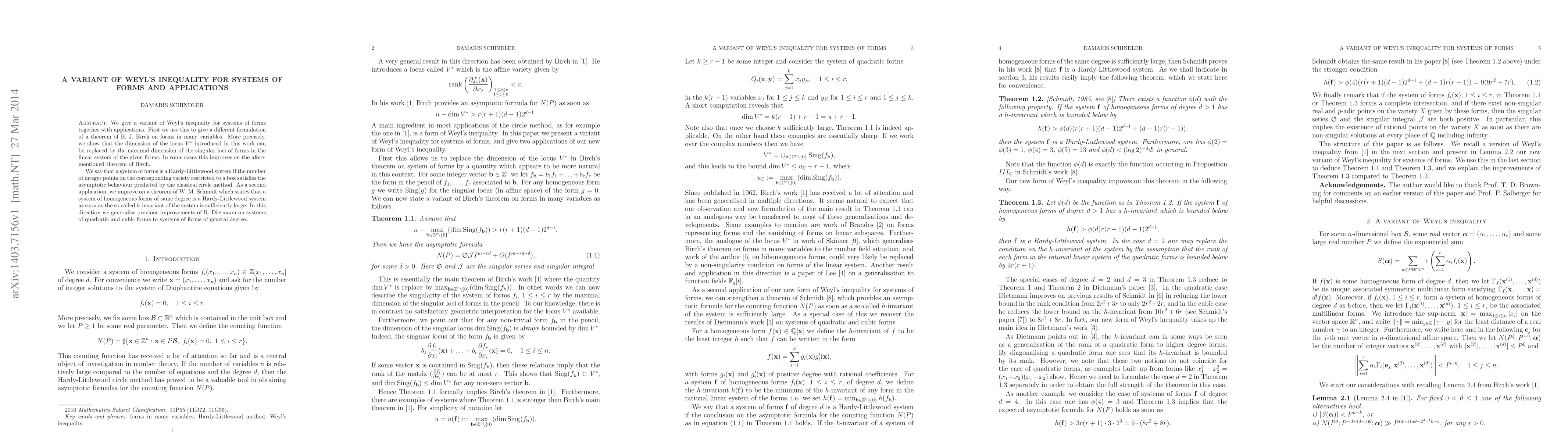 We give a variant of Weyl's inequality for systems of forms together with applications. First we use this to give a different formulation of a theorem of B. J. Birch on forms in many variables. More precisely, we show that the dimension of the locus V^* introduced in this work can be replaced by the maximal dimension of the singular loci of forms in the linear system of the given forms. In some cases this improves on the aforementioned theorem of Birch. We say that a system of forms is a Hardy-Littlewood system if the number of integer points on the corresponding variety restricted to a box satisfies the asymptotic behaviour predicted by the classical circle method. As a second application, we improve on a theorem of W. M. Schmidt which states that a system of homogeneous forms of same degree is a Hardy-Littlewood system as soon as the so called $h$-invariant of the system is sufficiently large. In this direction we generalise previous improvements of R. Dietmann on systems of quadratic and cubic forms to systems of forms of general degree.