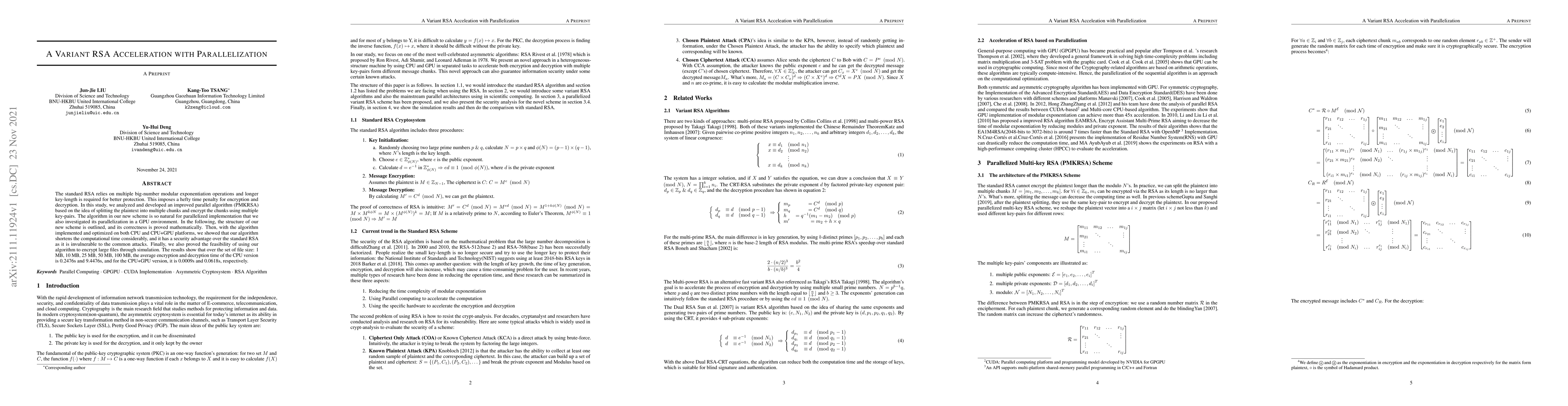 This paper proposes a parallel algorithm (PMKRSA) to accelerate the RSA encryption process by parallelizing modular exponentiation on multiple key-pairs and chunks of plaintext. The algorithm significantly reduces computational time on both CPU and CPU+GPU platforms, demonstrating enhanced security and efficiency for large file encryption.