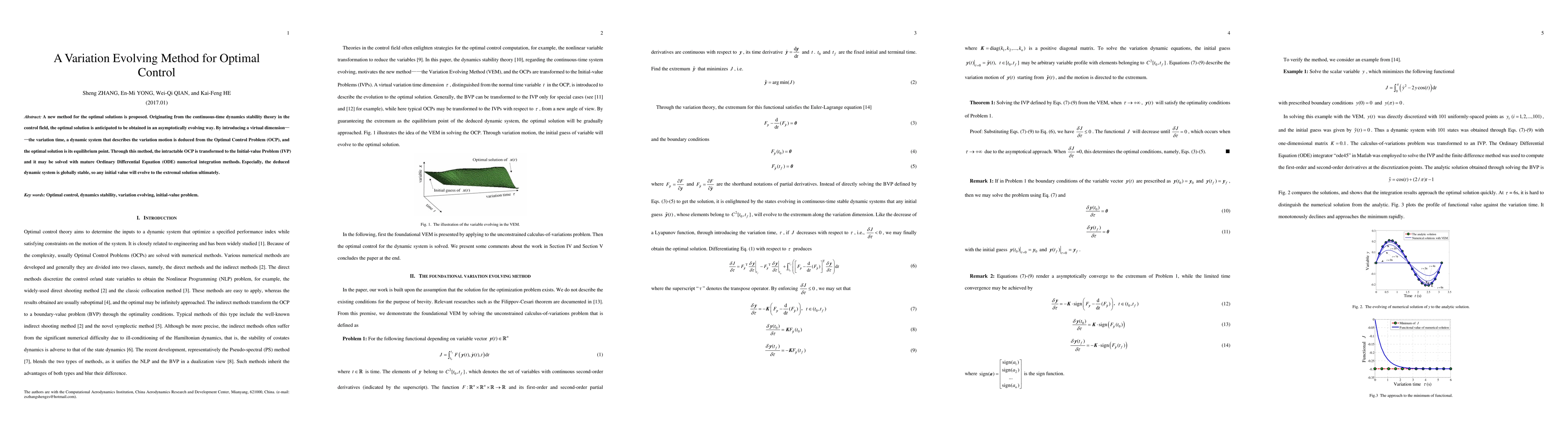 A new method for the optimal solutions is proposed. Originating from the continuous-time dynamics stability theory in the control field, the optimal solution is anticipated to be obtained in an asymptotically evolving way. By introducing a virtual dimension, the variation time, a dynamic system that describes the variation motion is deduced from the Optimal Control Problem (OCP), and the optimal solution is its equilibrium point. Through this method, the intractable OCP is transformed to the Initial-value Problem (IVP) and it may be solved with mature Ordinary Differential Equation (ODE) numerical integration methods. Especially, the deduced dynamic system is globally stable, so any initial value will evolve to the extremal solution ultimately.