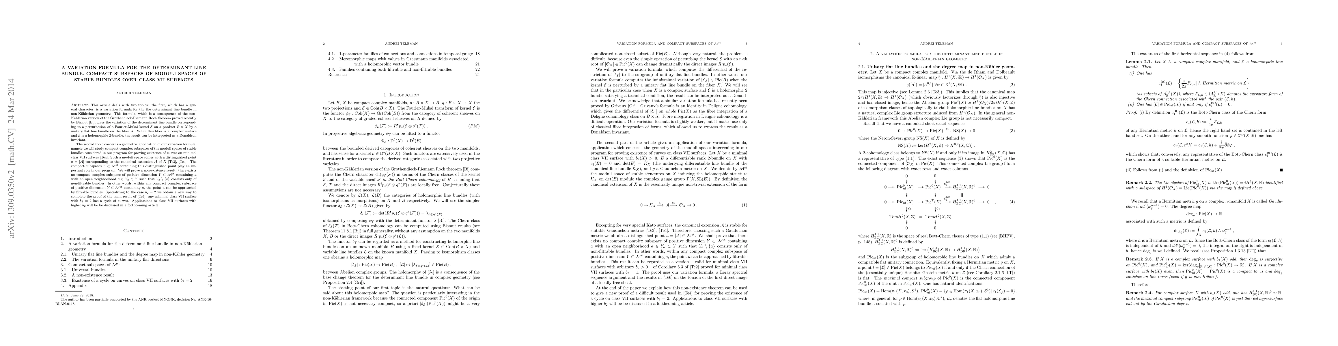 This article deals with two topics: the first, which has a general character, is a variation formula for the the determinant line bundle in non-K\"ahlerian geometry. This formula, which is a consequence of the non-K\"ahlerian version of the Grothendieck-Riemann Roch theorem proved recently by Bismut, gives the variation of the determinant line bundle corresponding to a perturbation of a Fourier-Mukai kernel ${\cal E}$ on a product $B\times X$ by a unitary flat line bundle on the fiber $X$. When this fiber is a complex surface and ${\cal E}$ is a holomorphic 2-bundle, the result can be interpreted as a Donaldson invariant. The second topic concerns a geometric application of our variation formula, namely we will study compact complex subspaces of the moduli spaces of stable bundles considered in our program for proving existence of curves on minimal class VII surfaces. Such a moduli space comes with a distinguished point $a=[{\cal A}]$ corresponding to the canonical extension ${\cal A}$ of $X$. The compact subspaces $Y\subset {\cal M}^\st$ containing this distinguished point play an important role in our program. We will prove a non-existence result: there exists no compact complex subspace of positive dimension $Y\subset {\cal M}^\st$ containing $a$ with an open neighborhood $a\in Y_a\subset Y$ such that $Y_a\setminus\{a\}$ consists only of non-filtrable bundles. In other words, within any compact complex subspace of positive dimension $Y\subset {\cal M}^\st$ containing $a$, the point $a$ can be approached by filtrable bundles. Specializing to the case $b_2=2$ we obtain a new way to complete the proof of a theorem in a previous article: any minimal class VII surface with $b_2=2$ has a cycle of curves. Applications to class VII surfaces with higher $b_2$ will be be discussed in a forthcoming article.