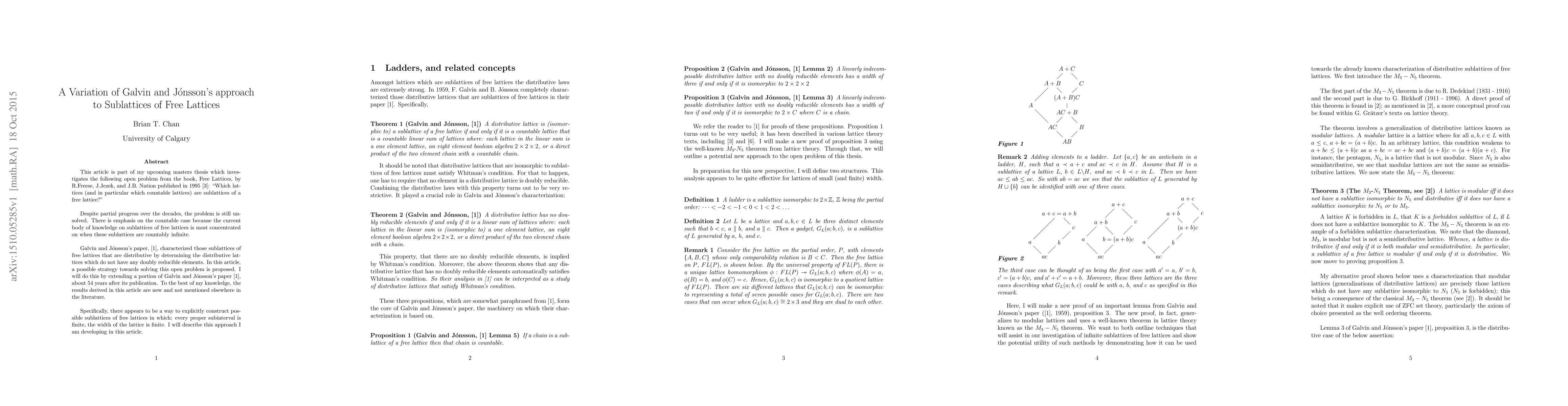 This article is part of my upcoming masters thesis which investigates the following open problem from the book, Free Lattices, by R.Freese, J.Jezek, and J.B. Nation published in 1995: "Which lattices (and in particular which countable lattices) are sublattices of a free lattice?" Despite partial progress over the decades, the problem is still unsolved. There is emphasis on the countable case because the current body of knowledge on sublattices of free lattices is most concentrated on when these sublattices are countably infinite. Galvin and Jonsson's paper characterized those sublattices of free lattices that are distributive by determining the distributive lattices which do not have any doubly reducible elements.. In this article, a possible strategy towards solving this open problem is proposed. I will do this by extending a portion of Galvin and Jonsson's paper, about 54 years after its publication. To the best of my knowledge, the results derived in this article are new and not mentioned elsewhere in the literature. Specifically, there appears to be a way to explicitly construct possible sublattices of free lattices in which: every proper subinterval is finite, the width of the lattice is finite. I will describe this approach I am developing in this article.